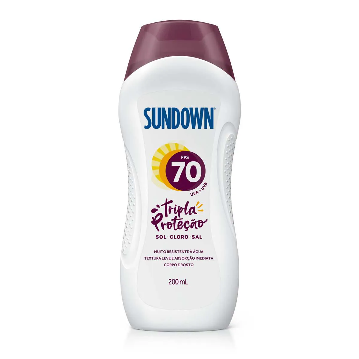 O Sundown Praia e Piscina é um protetor solar corporal com muito alta proteção contra os raios UVA e UVB, com FPS 70. É um produto seguro para uso familiar, que protege a pele contra as agressões do cloro e da água salgada, podendo ser aplicado no rosto e no corpo.