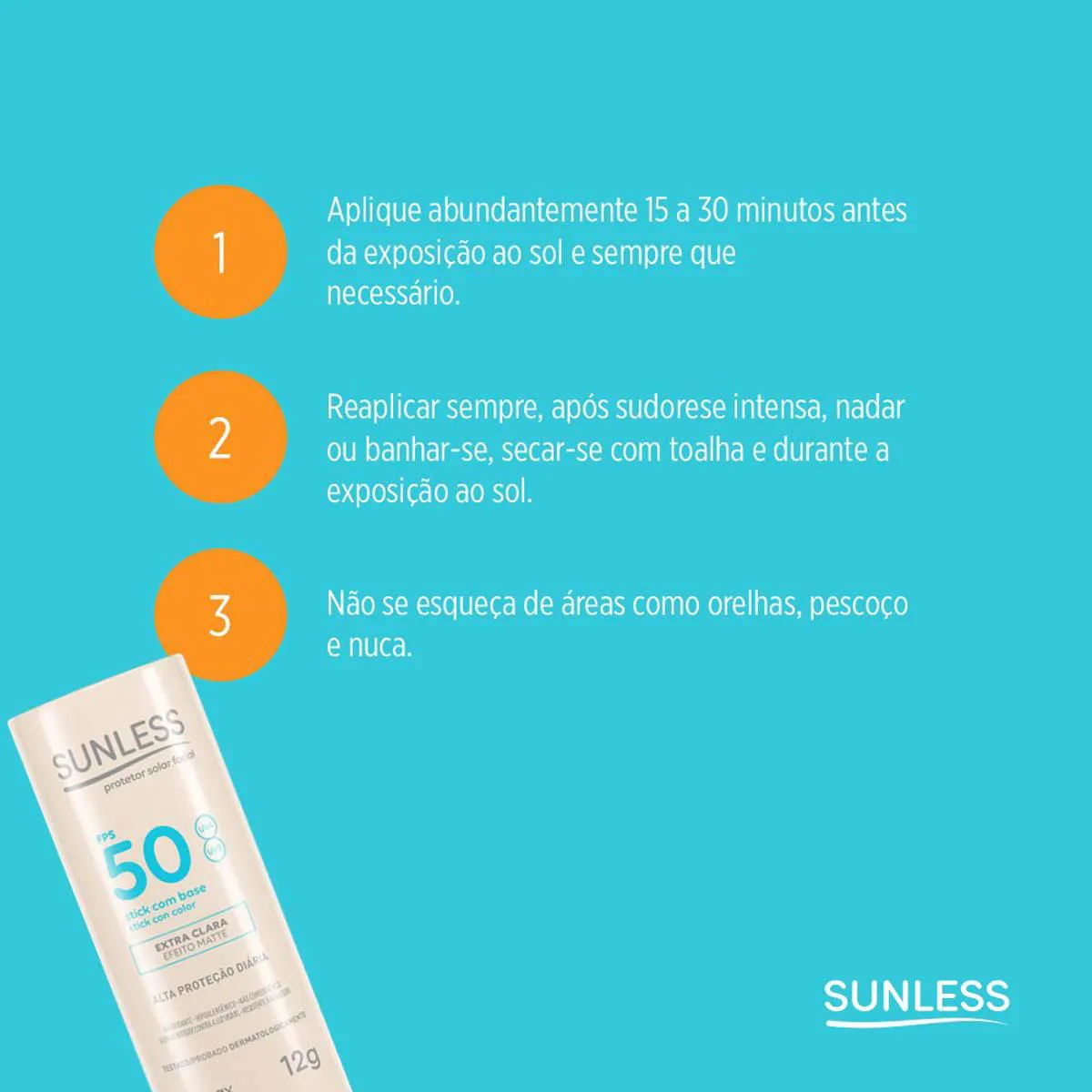 Sunless Stick é um protetor solar facial com base de alta cobertura de efeito matte que ajuda a tonalizar a pele e ainda contribui para disfarçar imperfeições e manchas. Hipoalergênico e não-comedogênico, este é um produto testado dermatologicamente para maior segurança na hora de aproveitar o sol.