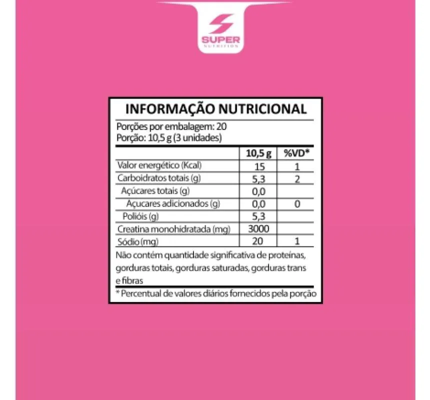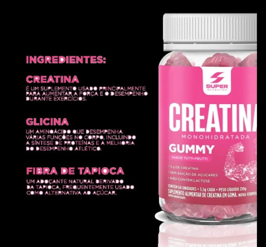 NOVIDADE: Apresentamos a Super Gummy creatina Sabor Tutti-Frutti! São 60 gummies por pote para você ingerir 3 unidades ao dia, ou conforme orientação de seu médico ou nutricionista. Adquira já!
