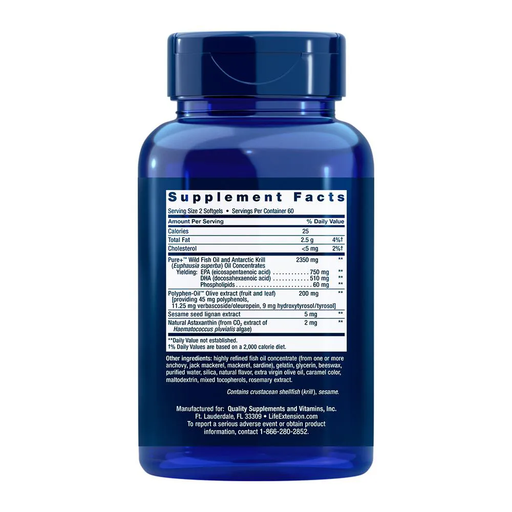 Combinação avançada de ômega-3 provenientes do óleo de peixe e do óleo de krill, aliados a componentes naturais como lignanas de gergelim, extrato de azeitona e astaxantina. Sua formulação balanceada atende às necessidades do corpo de maneira abrangente. 2. Fórmula pura e concentrada em cápsulas fáceis de consumir