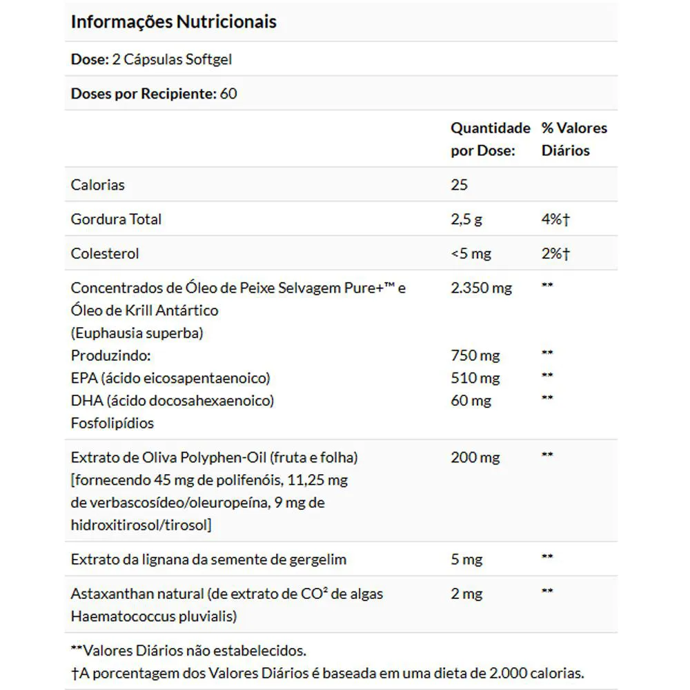 Além dos ácidos graxos essenciais EPA e DHA, sua formulação inclui extrato de azeitona padronizado, óleo de krill antártico e astaxantina. Elementos naturais que compõem uma fórmula completa e refinada. Validade longa