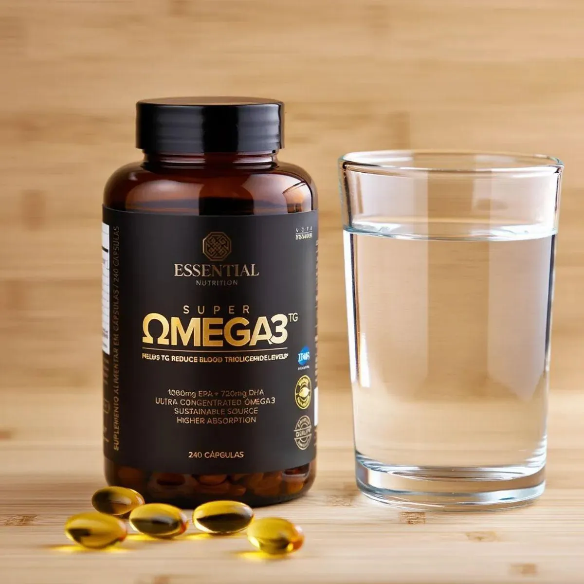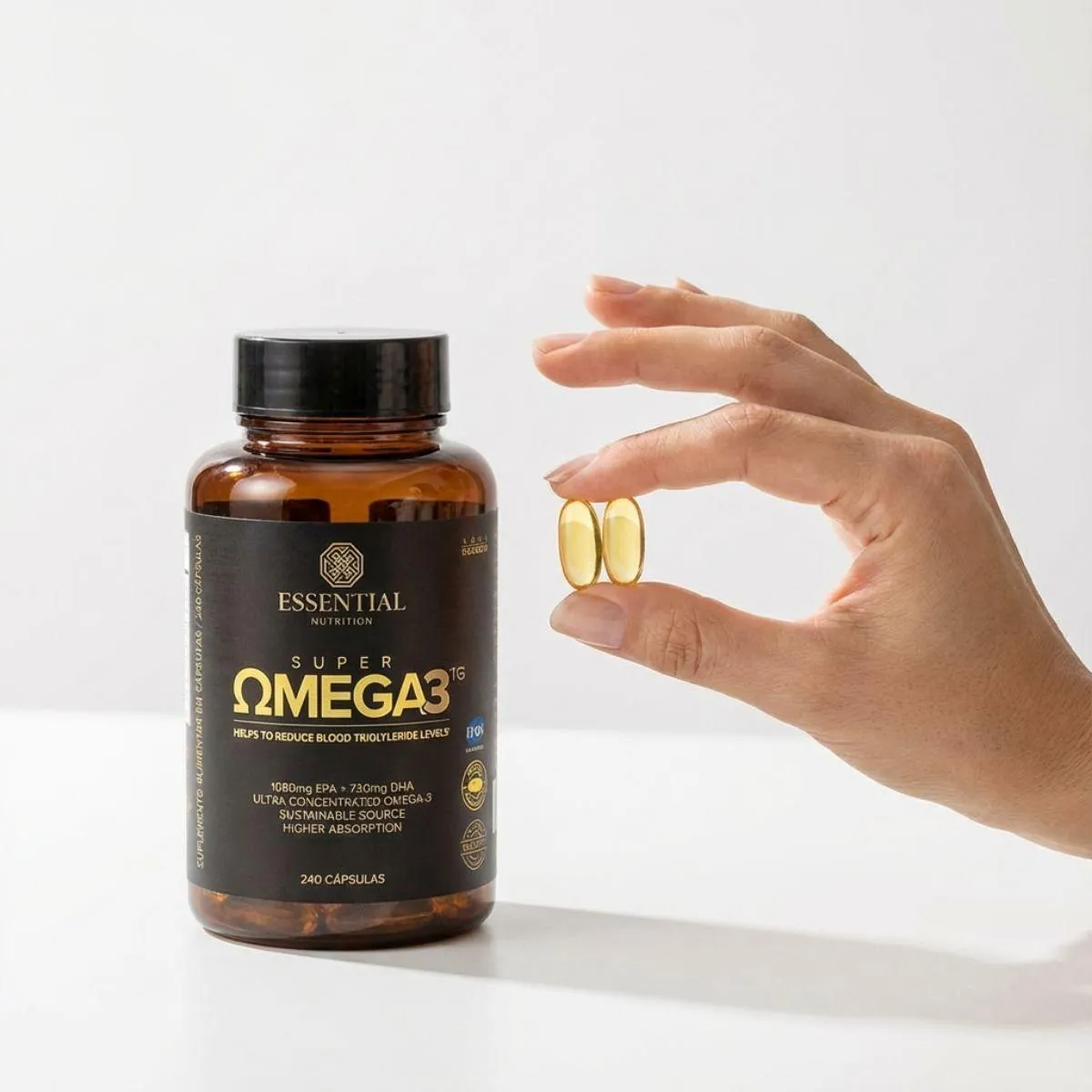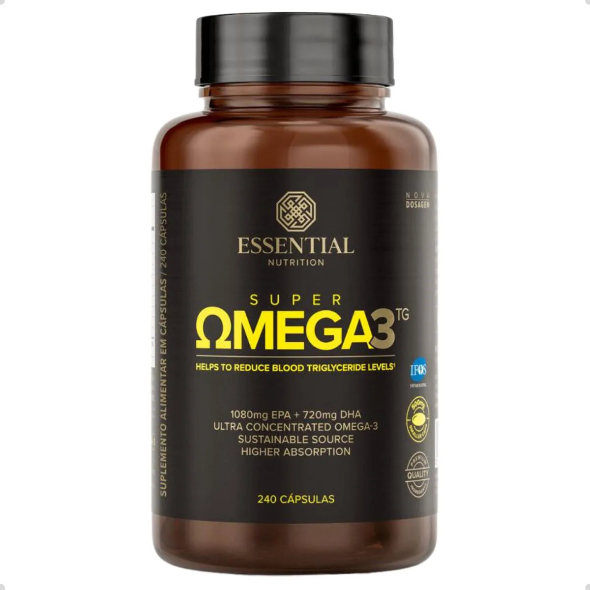 Super Ômega 3 TG da Essential Nutrition traz óleo de peixe em forma triglicerídeo altamente concentrado em EPA e DHA em 240 cápsulas de 500 mg. O produto visa facilitar a reposição diária desses ácidos graxos essenciais de forma prática.
