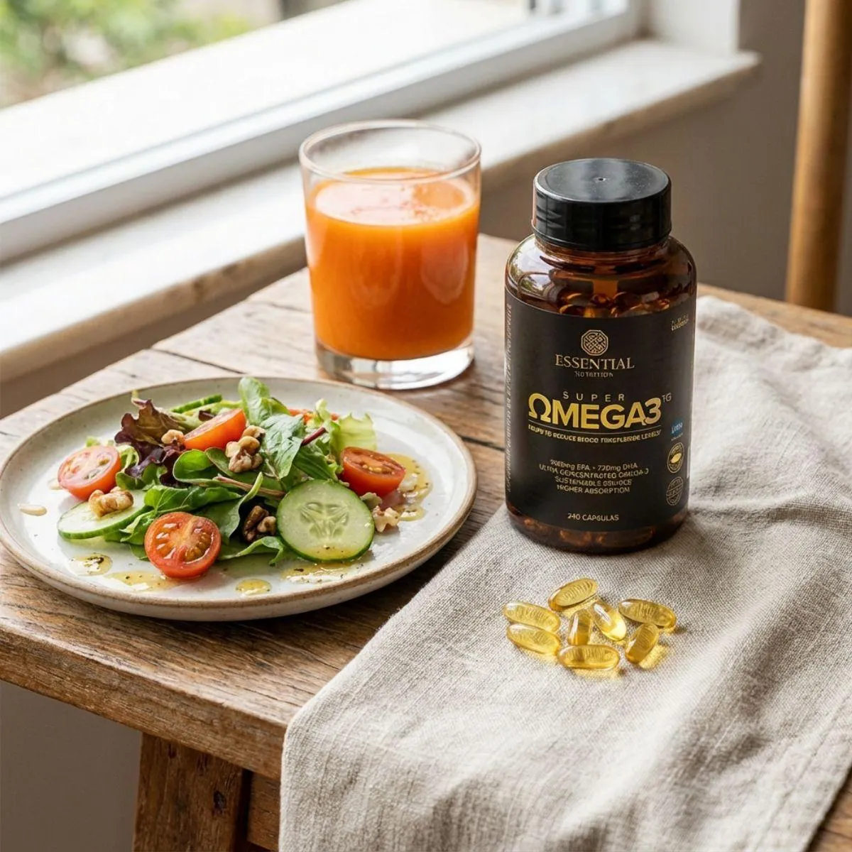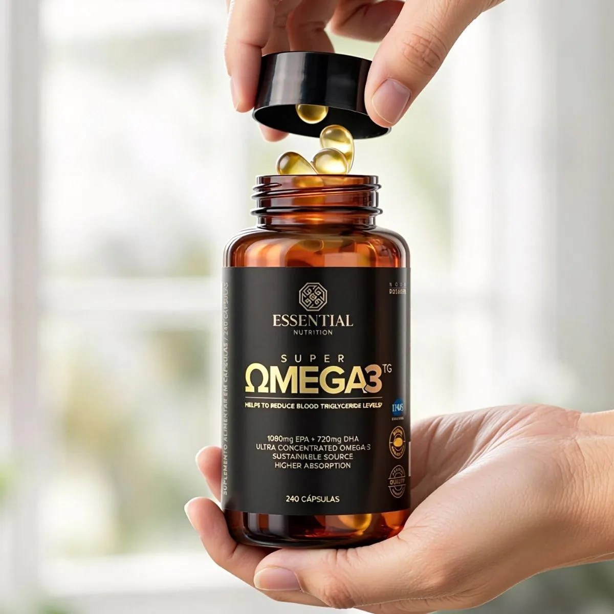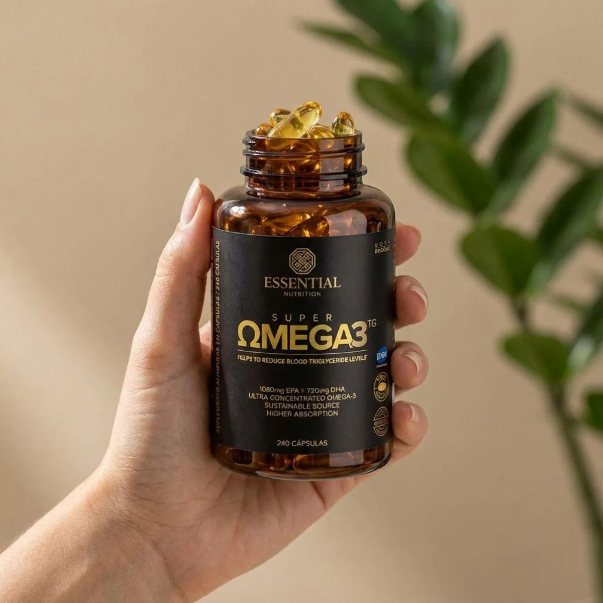 Super Ômega 3 TG da Essential Nutrition traz óleo de peixe em forma triglicerídeo altamente concentrado em EPA e DHA em 240 cápsulas de 500 mg. O produto visa facilitar a reposição diária desses ácidos graxos essenciais de forma prática.