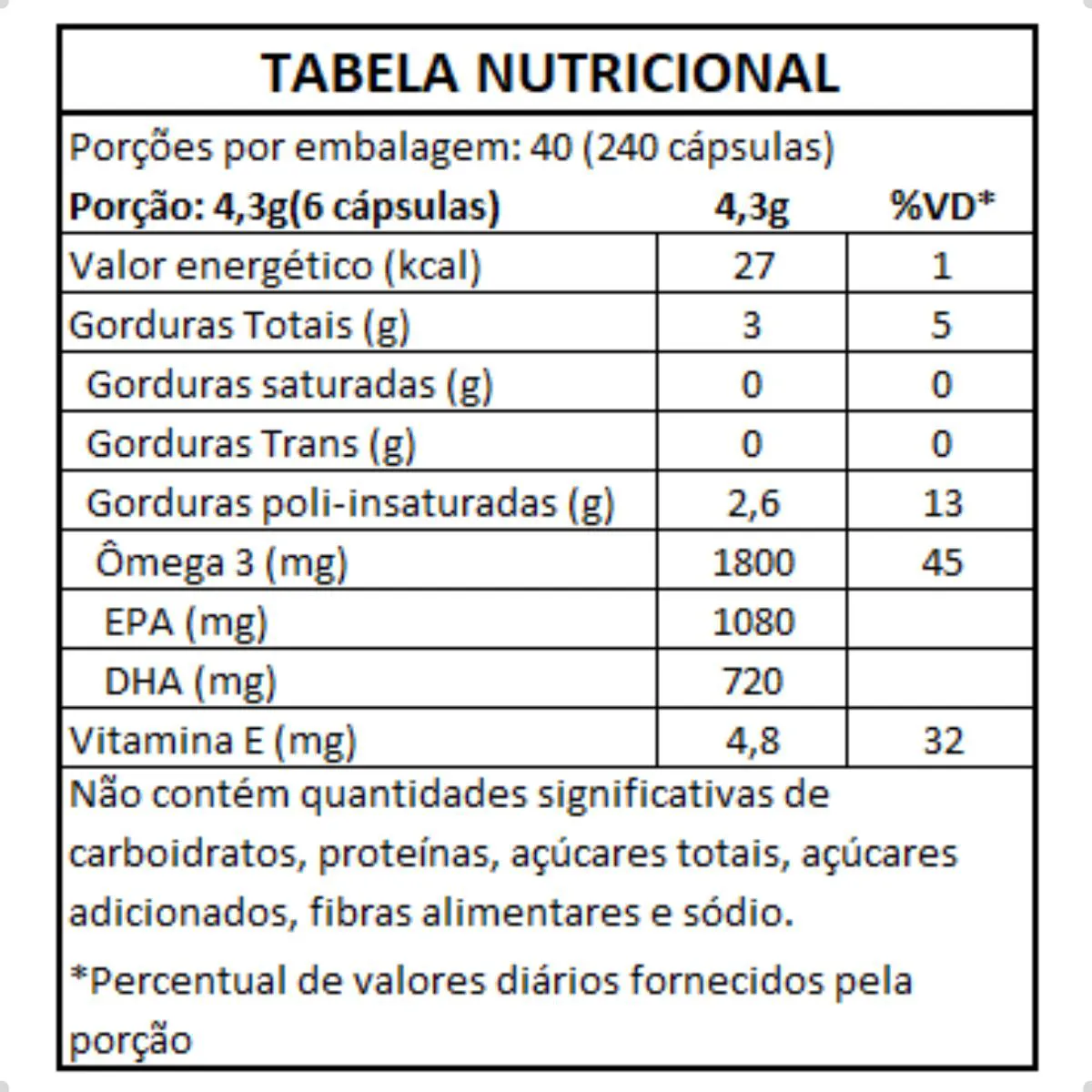 Cada porção oferece elevados níveis de ômega-3 purificado, com certificação de ausência de metais pesados e apoio de vitamina e natural como antioxidante. Não contém glúten, lactose, açúcar ou aditivos artificiais.