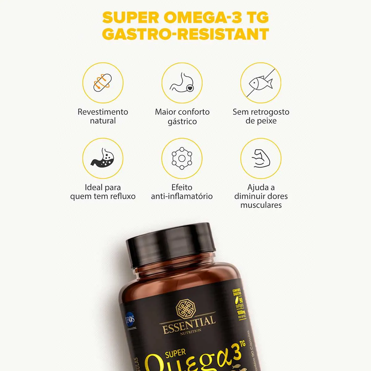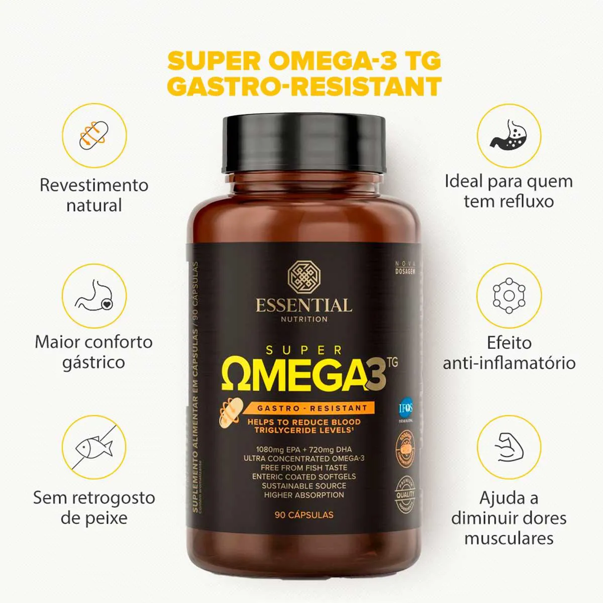Nesta versão, o Super Ômega-3 TG é revestido com a tecnologia de cápsulas entéricas com ingredientes naturais, ou seja, elas passam intactas pelo estômago e só se dissolvem no intestino, possibilitando o máximo de conforto digestivo. O QUE É SUPER ÔMEGA-3 TG GASTRO-RESISTANT? O Super Ômega-3 TG Gastro-Resistant Essential é uma opção pensada para oferecer o máximo de conforto gástrico. Suas cápsulas gastrorresistentes trazem todos os benefícios do óleo de peixe sem qualquer sensação de hálito ou retrogosto de peixe. Ideal para pessoas com maior sensibilidade digestiva ou que sofrem com refluxo. Assim como toda a nossa linha de Super Ômega-3 TG, a versão Gastro-Resistant também é certificada IFOS, livre de metais pesados e altamente concentrada em ômega-3 (EPA e DHA). PARA QUE SERVE? Fornecer, de maneira prática e confortável, alta concentração de ácido eicosapentaenoico (EPA) e ácido docosahexaenoico (DHA), substâncias não produzidas pelo corpo humano e que devem ser obtidas por meio de dieta ou suplementação. O óleo de peixe é o 3º suplemento mais consumido pelos brasileiros, atrás apenas dos polivitamínicos e dos repositores de cálcio. A suplementação de ômega-3 tem aumentado significativamente na última década. São inúmeros os estudos científicos que comprovam sua importância para os mais diversos fins. O QUE CONTÉM? 360mg EPA por cápsula 240mg DHA por cápsula NATURAL VITAMIN E NO FISHY TASTE O QUE NÃO CONTÉM? AÇÚCAR CORANTES CONSERVANTES E AROMAS ARTIFICIAIS EMULSIFICANTES METAIS PESADOS E OUTROS CONTAMINANTES COMO FUNCIONA? As cápsulas inteligentes liberam o conteúdo do ômega-3 apenas quando chegam ao intestino, impedindo que o efeito de retrogosto ou qualquer outro sabor de peixe possa ser sentido durante ou após a digestão. QUANDO NÃO DEVE SER UTILIZADO? Pessoas alérgicas a peixes e crustáceos devem evitar o consumo deste produto. Pessoas que apresentem doenças ou alterações fisiológicas, particularmente com alteração na coagulação sanguínea. Alérgicos: contém derivados de peixe e soja. COMO UTILIZAR? Recomendação de uso: Ingerir uma cápsula duas vezes ao dia, com as principais refeições, ou conforme orientação de médico ou nutricionista. INGREDIENTES: óleo de peixe (Pronova Pure ômega-3 TG) e d-alfa-tocoferol. Composição da cápsula: gelatina, água purificada e umectante glicerina. Revestimento externo: amido modificado, estabilizante alginato de sódio e umectante glicerina. NÃO CONTÉM GLÚTEN. ALÉRGICOS: CONTÉM DERIVADOS DE PEIXE. PODE CONTER DERIVADOS DE SOJA*. *PODE APRESENTAR TRAÇOS COMO CONSEQUÊNCIA DA PRESENÇA NÃO INTENCIONAL DURANTE ALGUMA ETAPA DA FABRICAÇÃO DAS MATÉRIAS-PRIMAS OU DA LINHA DE PRODUÇÃO. Registro no M.S. nº Produto dispensado de registro RDC240/2018