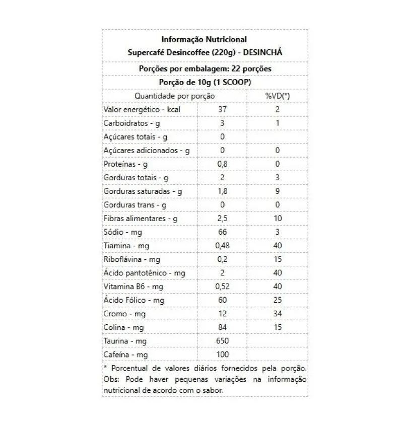 Supercafé Desincoffee (220g) Café, ingredientes premium e muito sabor! Supercafé Desincoffee é uma bebida revolucionária à base de café com mais ingredientes incríveis, totalmente diferente de tudo que você já provou. Combina ingredientes premium em uma formulação exclusiva. Possui 100mg de cafeína por porção que auxilia no aumento do estado de alerta e na melhora da concentração. O Supercafé Desincoffee te proporciona energia, foco e concentração. Com muito, muito sabor, serve para você encarar seus desafios diários, sejam eles de exigência física ou mental. É um combustível para que suas atividades terminem, mas sua energia não. Benefícios: * MELHOR DESEMPENHO PARA ATLETAS;* FOCO NO TRABALHO;* pré treino;* CONCENTRAÇÃO PARA ESTUDANTES;* BAIXO EM CALORIAS;* 100MG DE CAFÉINA;* 650MG DE TAURINA.