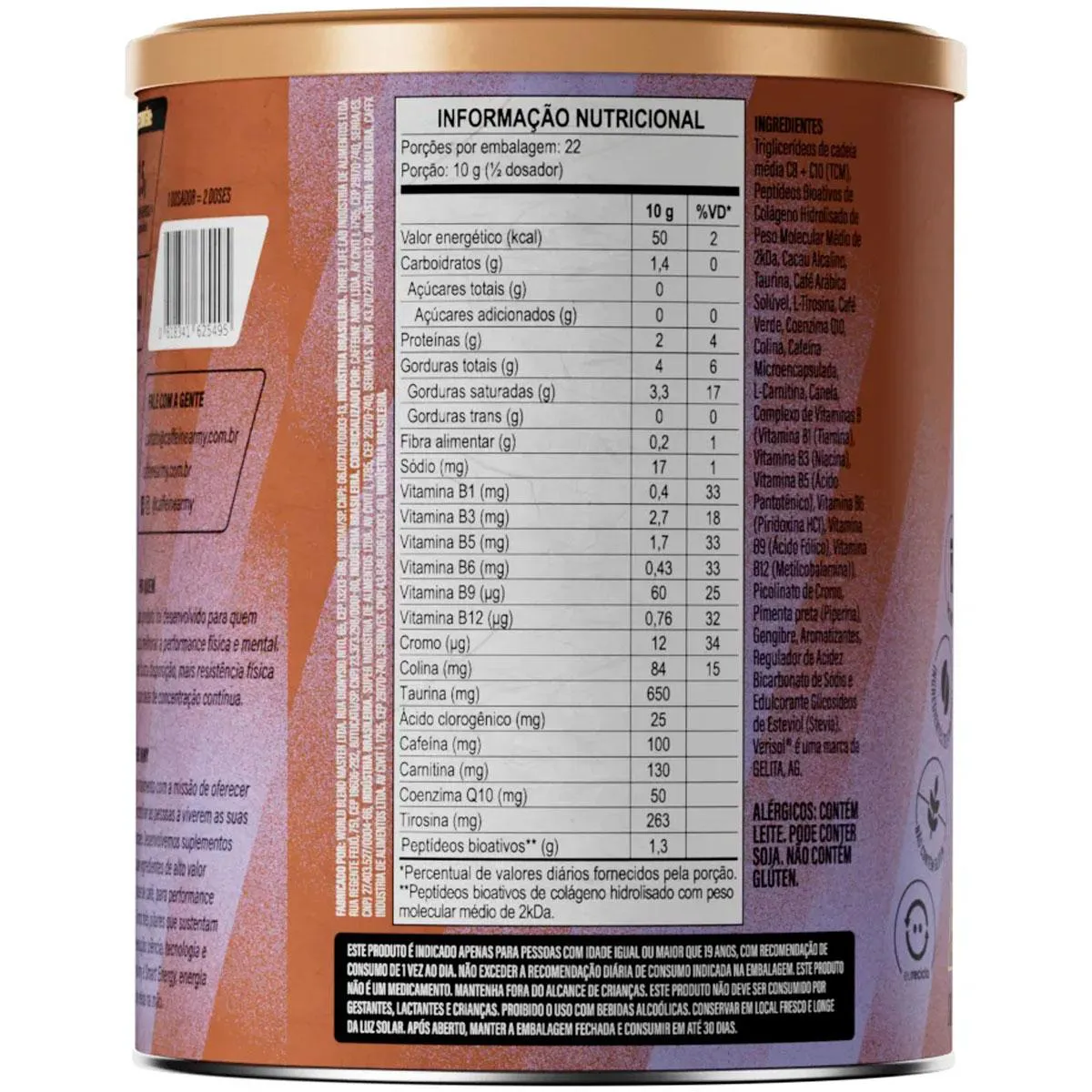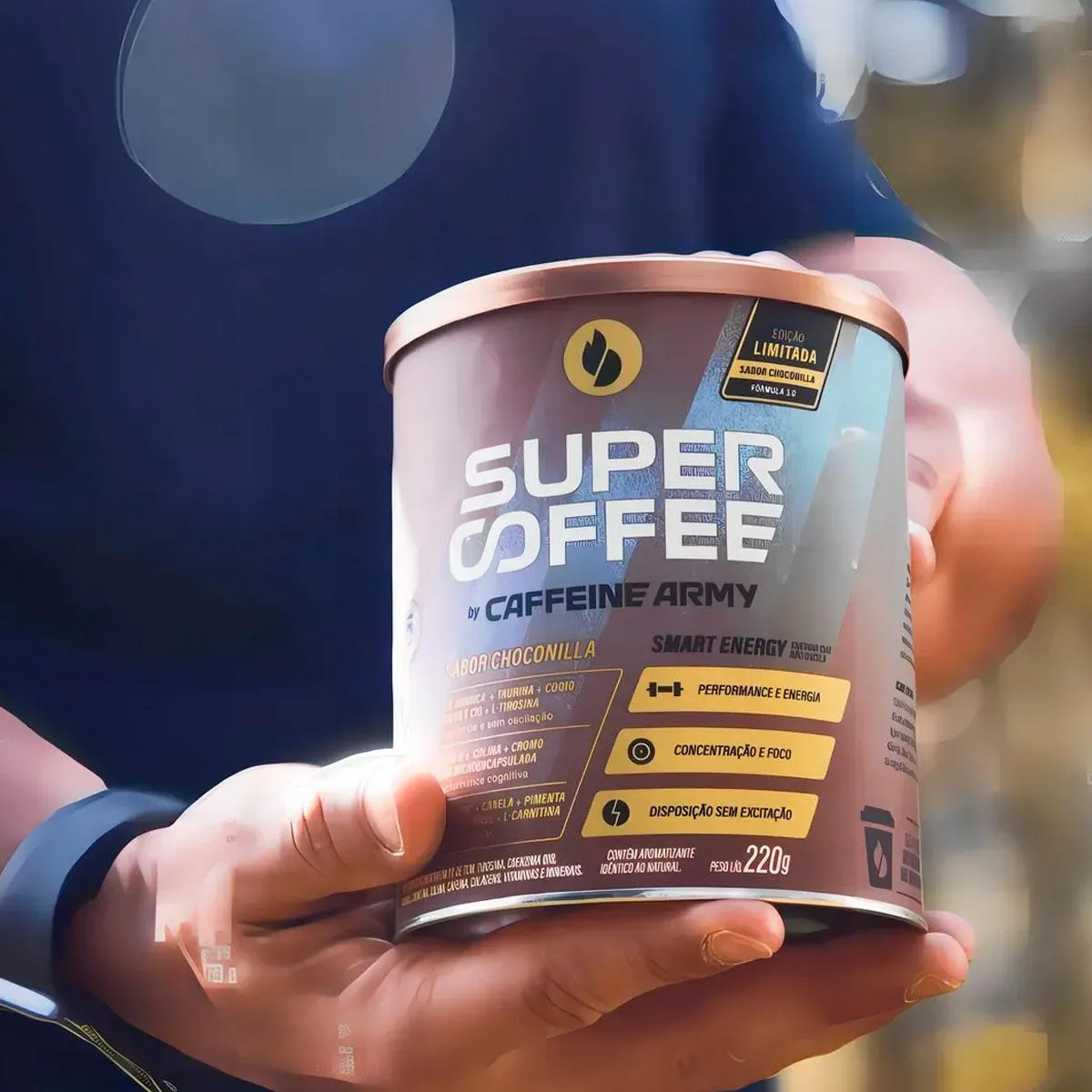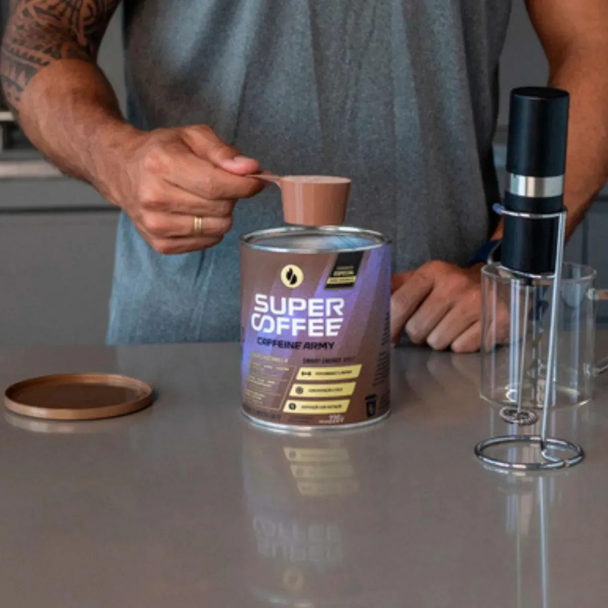 SUPER COFFEE 3.0 - CAFFEINE ARMY: Um blend de ingredientes naturais exclusivamente combinados para proporcionar uma dose extra de energia smart - estável e boa para o corpo e a mente. O SuperCoffee 3.0 é a evolução da incrível fórmula que você já conhece - agora ainda mais funcional e saboroso! O QUE É ? O SuperCoffee é uma bebida energética inteligente à base de café. Um blend com ingredientes naturais que vão te proporcionar energia estável e duradoura, ótimo para corpo, mente, saúde e bem estar. DIFERENCIAIS Originalidade é para poucos. Somos os criadores do conceito de blends energéticos à base de café e não existe produto igual ao SuperCoffee 3.0. TCM C8 E C10 São os melhores tipos de TCM disponíveis: fontes puras de energia e grandes potencializadores de corpos cetônicos. Bom para: saciedade, boa digestão e energia cerebral. 50MG DE COQ10 A CoQ10 tem propriedades antioxidantes e é fundamental para a produção de energia nas mitocôndrias das células, essencial para o bom funcionamento do organismo. colágeno VERISOL Único colágeno com comprovação científica de resultados, especialmente desenvolvido para manutenção da saúde da pele, melhorando a elasticidade e firmeza, além do fortalecimento das unhas e cabelos. L-TIROSINA Aminoácido precursor de neurotransmissores como a dopamina. Sua suplementação pode melhorar o seu humor e memória em situações de stress, assim como a sensação de bem-estar. SUGESTÃO DE CONSUMO O SuperCoffee é um produto instantâneo em pó. Basta adicionar uma porção (10g ou dosador) em 100ml de água quente ou gelada. Você pode utilizá-lo em jejum ao acordar ou 30 minutos antes da atividade física ou cognitiva. Recomendamos o consumo de 2 doses diárias para otimizar o resultado!