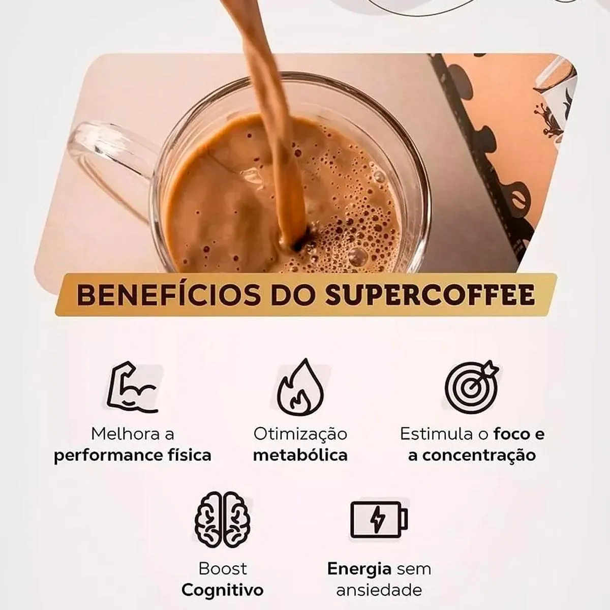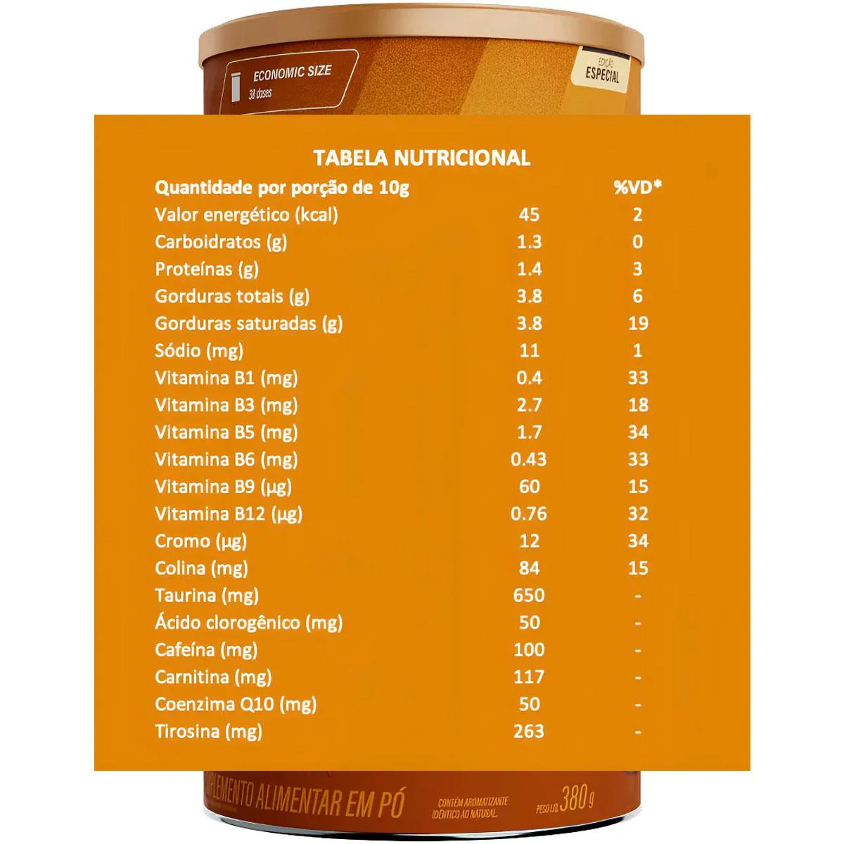 Novo SUPERCOFFEE 3.0 Economic Size 380g O Primeiro Smart Energy Do Mundo Energia Física E Mental Que Não Oscila Rico Em Boas Gorduras 15 Super Ingredientes Com 1,25g colágeno VERISOL Com 250mg CAFÉ VERDE Com 262,5 mg L-TIROSINA Com 50 mg COENZINA Q10 Zero Açúcar Zero Glúten O Supercoffee que você já conhece com cheirinho irresistíveis uma textura e leveza maravilhosas, agora ainda mais mais gostoso e o efeito muito potente na versão 3.0. Sua dose extra de energia smart - estável e boa para o corpo e a mente. Um blend de ingredientes que atua de forma combinada no estímulo à energia, resistência e humor diário, para você curtir cada desafio conquistado. O SuperCoffee 3.0 é um blend energético completo pensado para o seu bem-estar. Ele reúne múltiplos ativos em apenas uma fórmula. TCM C8 E C10 São os melhores tipos de TCM disponíveis: fontes puras de energia e grandes potencializadores de corpos cetônicos. Bom para: saciedade, boa digestão e energia cerebral. 50MG DE COQ10 A CoQ10 (50mg) tem propriedades antioxidantes e é fundamental para a produção de energia nas mitocôndrias das células, essencial para o bom funcionamento do organismo. COLÁGENO VERISOL® Único colágeno (1,25g) com comprovação científica de resultados, especialmente desenvolvido para manutenção da saúde da pele, melhorando a elasticidade e firmeza, além do fortalecimento das unhas e cabelos. L-TIROSINA Aminoácido precursor de neurotransmissores como a dopamina. Sua suplementação pode melhorar o seu humor e memória em situações de stress, assim como a sensação de bem-estar. ENERGIA LIMPA E SEM OSCILAÇÃO CAFÉ ARÁBICA + TAURINA + COQ10 (NOVO!) + TCM C8 E C10 + L-TIROSINA (NOVO!) Energia smart - natural, na medida e estável - para você ser você por inteiro. Sem sensação de nervosismo e/ou ansiedade. Um blend de ingredientes que atua de forma combinada no estímulo à energia, resistência e humor diário, para você curtir cada desafio conquistado. FOCO E PERFORMANCE COGNITIVA COMPLEXO B + COLINA + CROMO + CAFEÍNA MICROENCAPSULADA Uma dose de SuperCoffee pode te levar a um estado onde tudo flui - corpo e mente em perfeita harmonia para alcançar a excelência enquanto trabalha ou estuda. O blend cognitivo atua no suporte da sinalização celular, transportando, estimulando ou equilibrando os sinais entre neurônios, células nervosas e outras células do corpo. METABOLISMO E BEM-ESTAR COLÁGENO VERISOL® (NOVO!) + CANELA + PIMENTA PRETA + GENGIBRE + CAFÉ VERDE (NOVO!) + L-CARNITINA O avanço da idade altera o funcionamento do corpo e a suplementação faz toda diferença. Alcançar um estado de otimização metabólica é sinônimo de potencializar suas funções vitais. Ativos com ação antioxidante e termogênica agem estimulando o metabolismo. Já o colágeno, uma das proteínas mais importantes para o corpo, é especial para a saúde da pele, cabelo e unhas, ajudando a mantê-los fortes e saudáveis. Ao escolher o SuperCoffee 3.0, você economiza 75% em comparação à compra dos suplementos individualmente. Para usar: Manhã: em jejum ao acordar para uma explosão de energia no início do seu dia. Treino: 30 minutos antes para acelerar o seu metabolismo e dar um suporte muscular com muita energia. Trabalho: Para ajudá-lo a se concentrar no trabalho ou antes de uma grande reunião. Estudo: Para te focar nos estudos ou antes de importantes prova Como devo tomar meu SuperCoffee? O SuperCoffee é um produto instantâneo em pó. Basta adicionar uma porção (10g ou dosador) em 100ml de água quente ou gelada. Recomendamos o consumo de 2 doses diárias para otimizar o resultado! Latão 380g de produto em pó rende até 38 doses. Advertências: "ESTE PRODUTO NÃO É UM MEDICAMENTO" "ESTE PRODUTO É UM SUPLEMENTO ALIMENTAR" "MANTENHA FORA DO ALCANCE DE CRIANÇAS" "NÃO EXCEDER A RECOMENDAÇÃO DIÁRIA DE CONSUMO INDICADA NA EMBALAGEM" Registro no M.S. nº Produto dispensado de registro RDC 240 de 2018