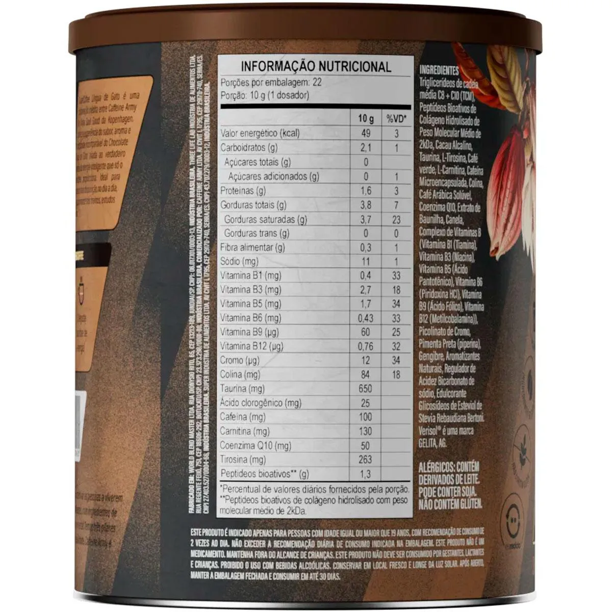 Supercoffee Lingua de Gato 220g Classic Size - Caffeine Army O equilíbrio perfeito entre sabor e energia. 22 doses da combinação funcional e saborosa de ingredientes naturais e alta tecnologia que proporcionam a dose certa de energia limpa, estável e duradoura. Quando você consome o formato comum de cafeína - como num café preto - seu corpo absorve essa cafeína rapidamente. O resultado é um pico de energia momentânea e efeitos colaterais como ansiedade. O grande segredo do SuperCoffee está na tecnologia da cafeína timerelease. Esse tipo especial de cafeína possui uma absorção mais lenta pelo corpo, proporcionando uma energia limpa, sustentável e duradoura durante o dia - sem efeitos colaterais. O blend energético foi pensado para que você aproveite uma energia smart: inteligente, natural e que não oscila - mesmo com pequenas dosagens de cafeína. Combinação entre Cafeína Timerelease, Taurina, COQ10, TCM C8 e C10 e L-Tirosina, que proporciona, ao mesmo tempo, estímulo na medida certa e produção de energia a nível celular. INGREDIENTES: triglicerídeos de cadeia média C8 + C10 (TCM), colágeno hidrolisado, cacau alcalino em pó, taurina, L-tirosina, café verde moído, L-carnitina L-tartarato, cafeína microencapsulada, bitartarato de colina, café arábica solúvel, coenzima Q10, especiarias, complexo de vitaminas B (tiamina mononitrato (vitamina B1), nicotinamida (vitamina B3), D-pantotenato de cálcio (vitamina B5), cloridrato de piridoxina (vitamina B6), ácido N-pteroil-L-glutâmico (vitamina B9), cianocobalamina (vitamina B12)), picolinato de cromo, aromatizantes naturais, regulador de acidez bicarbonato de sódio e edulcorante glicosídeos de esteviol de Stevia rebaudiana Bertoni. Advertências: "ESTE PRODUTO NÃO É UM MEDICAMENTO" "ESTE PRODUTO É UM SUPLEMENTO ALIMENTAR" "MANTENHA FORA DO ALCANCE DE CRIANÇAS" "NÃO EXCEDER A RECOMENDAÇÃO DIÁRIA DE CONSUMO INDICADA NA EMBALAGEM" Registro no M.S. nº Produto dispensado de registro RDC 240 de 2018