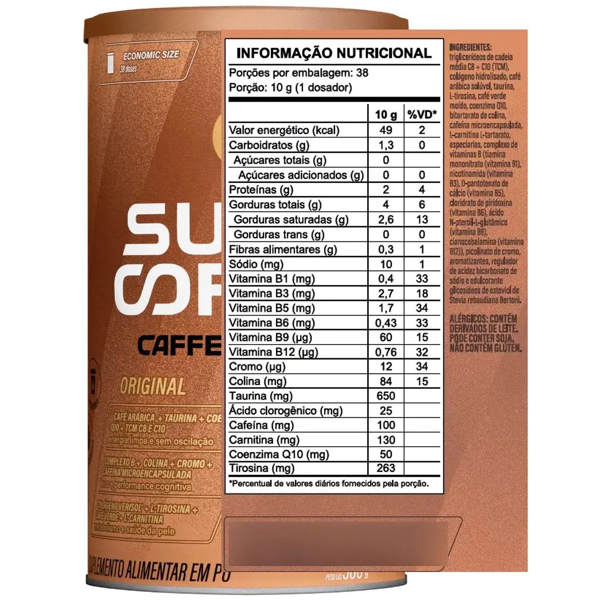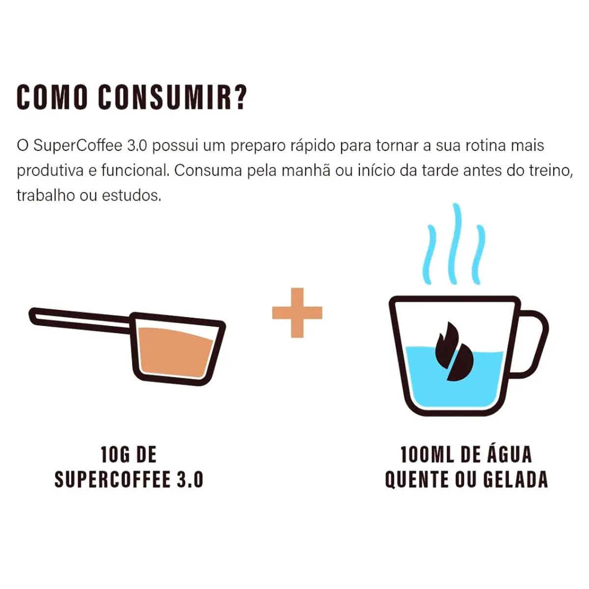 Novo SUPERCOFFEE 3.0 Economic Size 380g O Primeiro Smart Energy Do Mundo Energia Física E Mental Que Não Oscila Rico Em Boas Gorduras 15 Super Ingredientes Com 1,25g colágeno VERISOL Com 250mg CAFÉ VERDE Com 262,5 mg L-TIROSINA Com 50 mg COENZINA Q10 Zero Açúcar Zero Glúten O Supercoffee que você já conhece com cheirinho irresistíveis uma textura e leveza maravilhosas, agora ainda mais mais gostoso e o efeito muito potente na versão 3.0. Sua dose extra de energia smart - estável e boa para o corpo e a mente. Um blend de ingredientes que atua de forma combinada no estímulo à energia, resistência e humor diário, para você curtir cada desafio conquistado. O SuperCoffee 3.0 é um blend energético completo pensado para o seu bem-estar. Ele reúne múltiplos ativos em apenas uma fórmula. TCM C8 E C10 São os melhores tipos de TCM disponíveis: fontes puras de energia e grandes potencializadores de corpos cetônicos. Bom para: saciedade, boa digestão e energia cerebral. 50MG DE COQ10 A CoQ10 (50mg) tem propriedades antioxidantes e é fundamental para a produção de energia nas mitocôndrias das células, essencial para o bom funcionamento do organismo. COLÁGENO VERISOL® Único colágeno (1,25g) com comprovação científica de resultados, especialmente desenvolvido para manutenção da saúde da pele, melhorando a elasticidade e firmeza, além do fortalecimento das unhas e cabelos. L-TIROSINA Aminoácido precursor de neurotransmissores como a dopamina. Sua suplementação pode melhorar o seu humor e memória em situações de stress, assim como a sensação de bem-estar. ENERGIA LIMPA E SEM OSCILAÇÃO CAFÉ ARÁBICA + TAURINA + COQ10 (NOVO!) + TCM C8 E C10 + L-TIROSINA (NOVO!) Energia smart - natural, na medida e estável - para você ser você por inteiro. Sem sensação de nervosismo e/ou ansiedade. Um blend de ingredientes que atua de forma combinada no estímulo à energia, resistência e humor diário, para você curtir cada desafio conquistado. FOCO E PERFORMANCE COGNITIVA COMPLEXO B + COLINA + CROMO + CAFEÍNA MICROENCAPSULADA Uma dose de SuperCoffee pode te levar a um estado onde tudo flui - corpo e mente em perfeita harmonia para alcançar a excelência enquanto trabalha ou estuda. O blend cognitivo atua no suporte da sinalização celular, transportando, estimulando ou equilibrando os sinais entre neurônios, células nervosas e outras células do corpo. METABOLISMO E BEM-ESTAR COLÁGENO VERISOL® (NOVO!) + CANELA + PIMENTA PRETA + GENGIBRE + CAFÉ VERDE (NOVO!) + L-CARNITINA O avanço da idade altera o funcionamento do corpo e a suplementação faz toda diferença. Alcançar um estado de otimização metabólica é sinônimo de potencializar suas funções vitais. Ativos com ação antioxidante e termogênica agem estimulando o metabolismo. Já o colágeno, uma das proteínas mais importantes para o corpo, é especial para a saúde da pele, cabelo e unhas, ajudando a mantê-los fortes e saudáveis. Ao escolher o SuperCoffee 3.0, você economiza 75% em comparação à compra dos suplementos individualmente. Para usar: Manhã: em jejum ao acordar para uma explosão de energia no início do seu dia. Treino: 30 minutos antes para acelerar o seu metabolismo e dar um suporte muscular com muita energia. Trabalho: Para ajudá-lo a se concentrar no trabalho ou antes de uma grande reunião. Estudo: Para te focar nos estudos ou antes de importantes prova Como devo tomar meu SuperCoffee? O SuperCoffee é um produto instantâneo em pó. Basta adicionar uma porção (10g ou dosador) em 100ml de água quente ou gelada. Recomendamos o consumo de 2 doses diárias para otimizar o resultado! Latão 380g de produto em pó rende até 38 doses. Advertências: "ESTE PRODUTO NÃO É UM MEDICAMENTO" "ESTE PRODUTO É UM SUPLEMENTO ALIMENTAR" "MANTENHA FORA DO ALCANCE DE CRIANÇAS" "NÃO EXCEDER A RECOMENDAÇÃO DIÁRIA DE CONSUMO INDICADA NA EMBALAGEM" Registro no M.S. nº Produto dispensado de registro RDC 240 de 2018