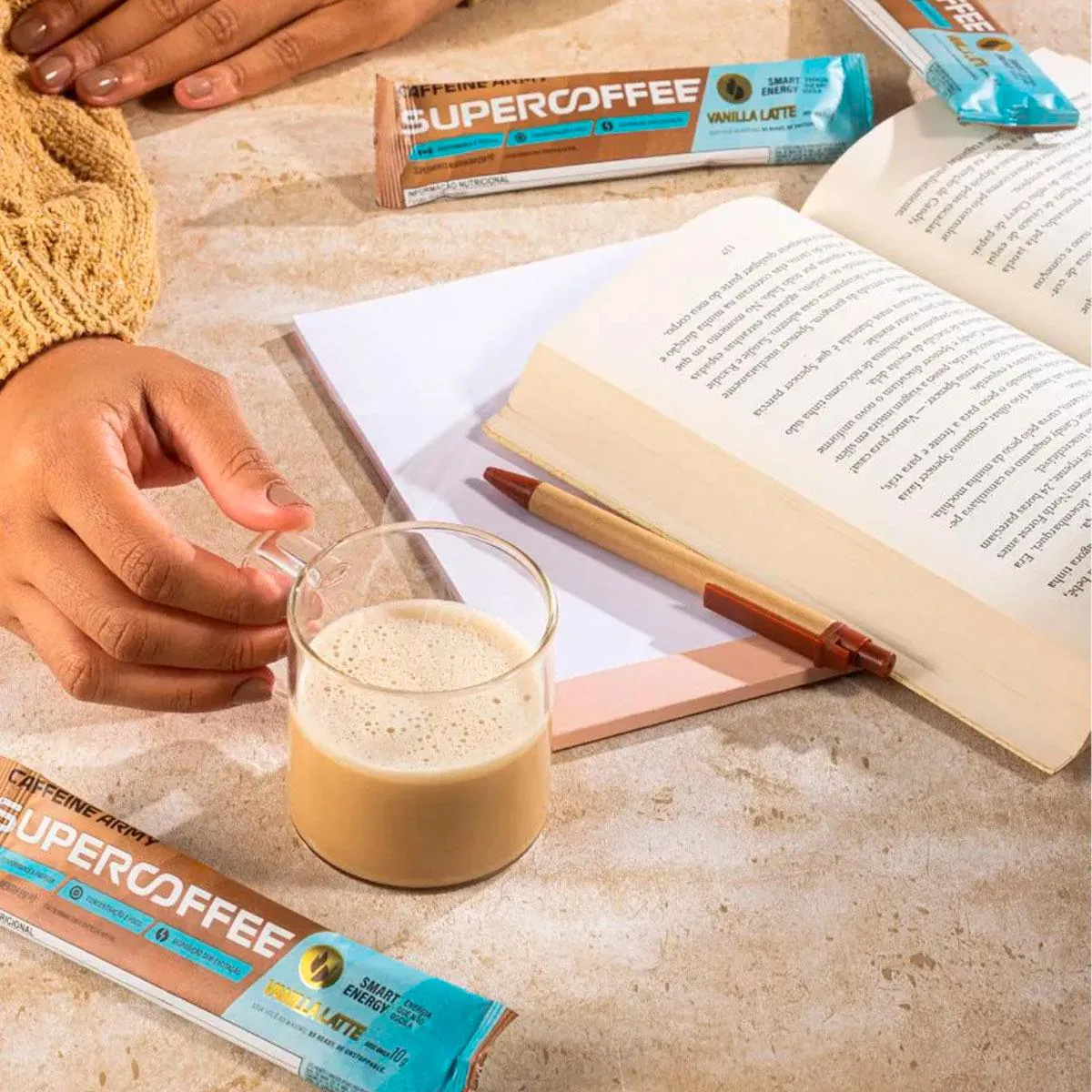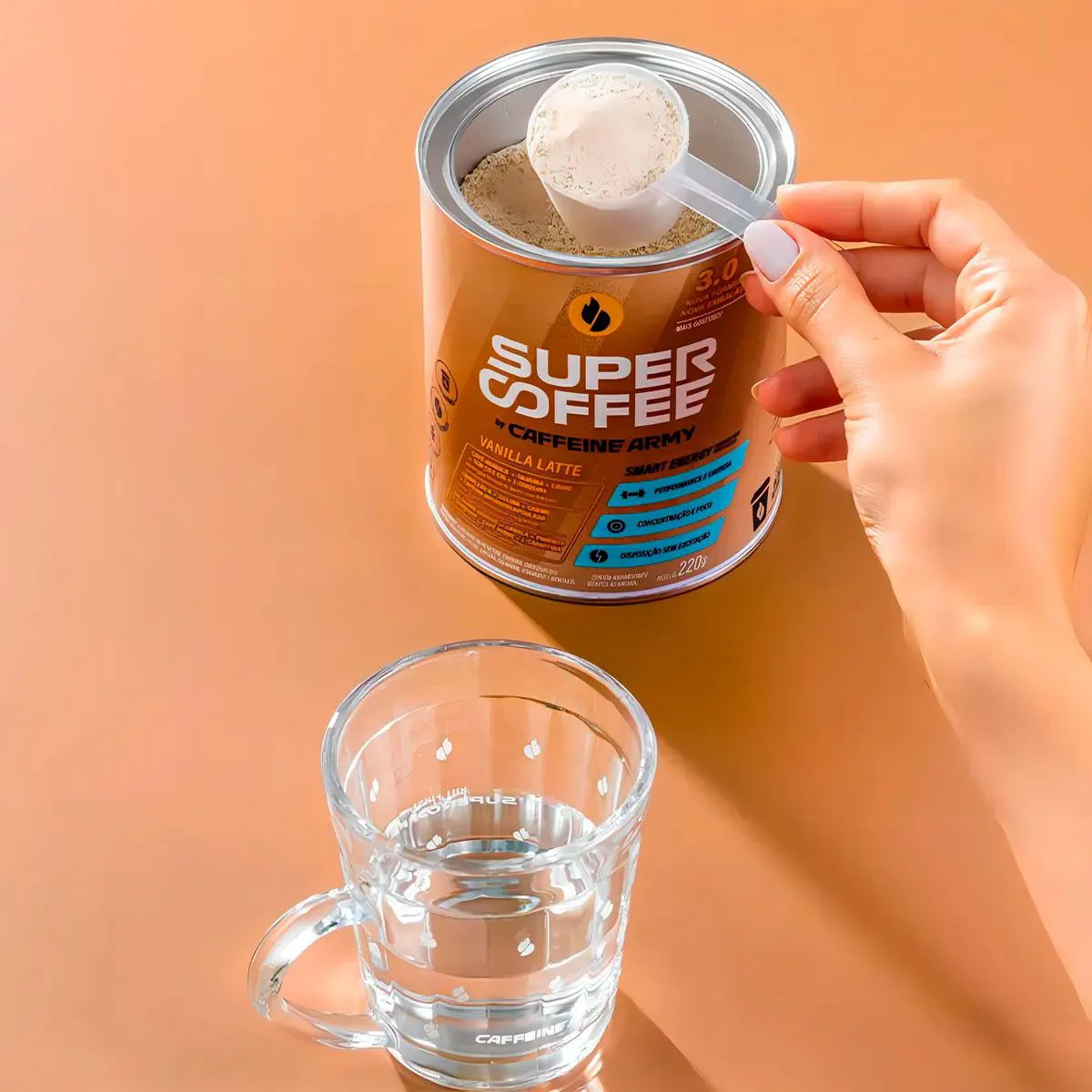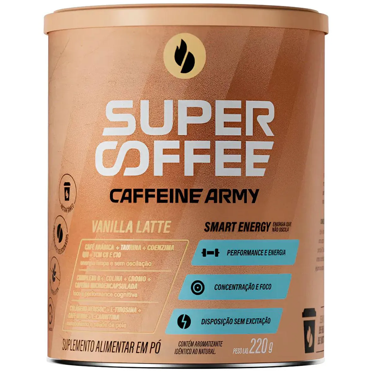 SUPER COFFEE 3.0 - CAFFEINE ARMY: Um blend de ingredientes naturais exclusivamente combinados para proporcionar uma dose extra de energia smart - estável e boa para o corpo e a mente. O SuperCoffee 3.0 é a evolução da incrível fórmula que você já conhece - agora ainda mais funcional e saboroso! O QUE É O SuperCoffee é uma bebida energética inteligente à base de café. Um blend com ingredientes naturais que vão te proporcionar energia estável e duradoura, ótimo para corpo, mente, saúde e bem estar. DIFERENCIAIS Originalidade é para poucos. Somos os criadores do conceito de blends energéticos à base de café e não existe produto igual ao SuperCoffee 3.0. TCM C8 E C10 São os melhores tipos de TCM disponíveis: fontes puras de energia e grandes potencializadores de corpos cetônicos. Bom para: saciedade, boa digestão e energia cerebral. 50MG DE COQ10 A CoQ10 tem propriedades antioxidantes e é fundamental para a produção de energia nas mitocôndrias das células, essencial para o bom funcionamento do organismo. colágeno VERISOL Único colágeno com comprovação científica de resultados, especialmente desenvolvido para manutenção da saúde da pele, melhorando a elasticidade e firmeza, além do fortalecimento das unhas e cabelos. L-TIROSINA Aminoácido precursor de neurotransmissores como a dopamina. Sua suplementação pode melhorar o seu humor e memória em situações de stress, assim como a sensação de bem-estar. SUGESTÃO DE CONSUMO O SuperCoffee é um produto instantâneo em pó. Basta adicionar uma porção (10g ou dosador) em 100ml de água quente ou gelada. Você pode utilizá-lo em jejum ao acordar ou 30 minutos antes da atividade física ou cognitiva. Recomendamos o consumo de 2 doses diárias para otimizar o resultado! Advertências: "ESTE PRODUTO NÃO É UM MEDICAMENTO" "ESTE PRODUTO É UM SUPLEMENTO ALIMENTAR" "MANTENHA FORA DO ALCANCE DE CRIANÇAS" "NÃO EXCEDER A RECOMENDAÇÃO DIÁRIA DE CONSUMO INDICADA NA EMBALAGEM" Registro no M.S. nº Produto dispensado de registro RDC 240 de 2018