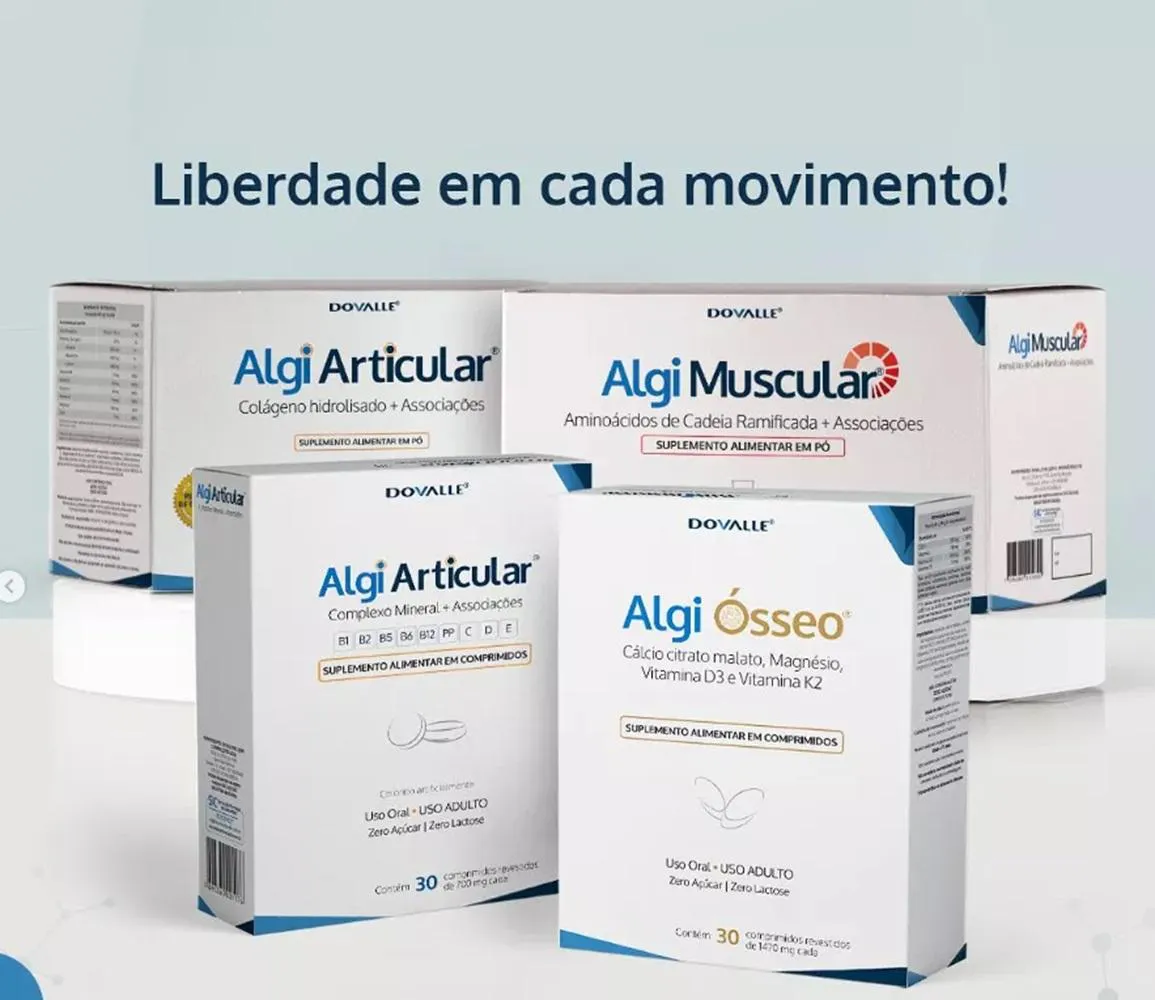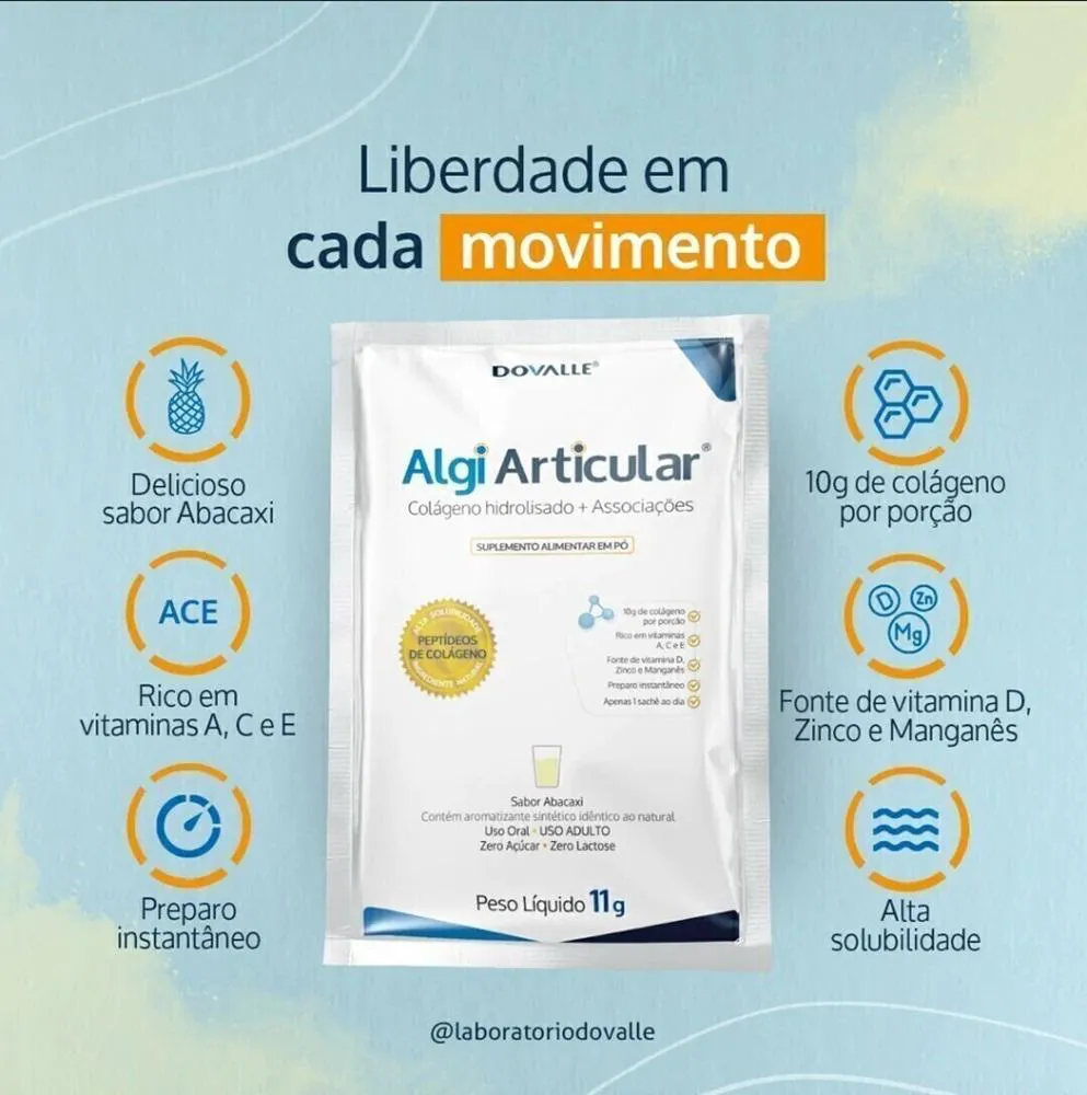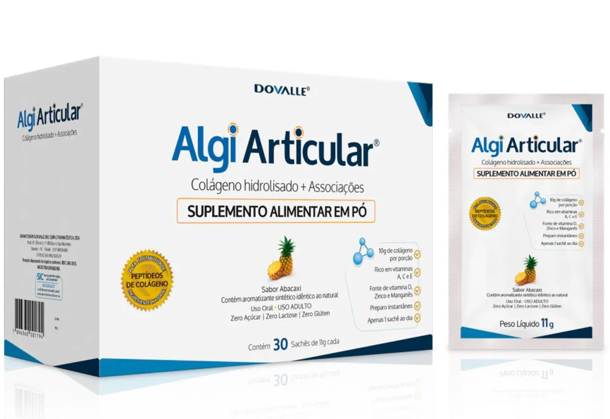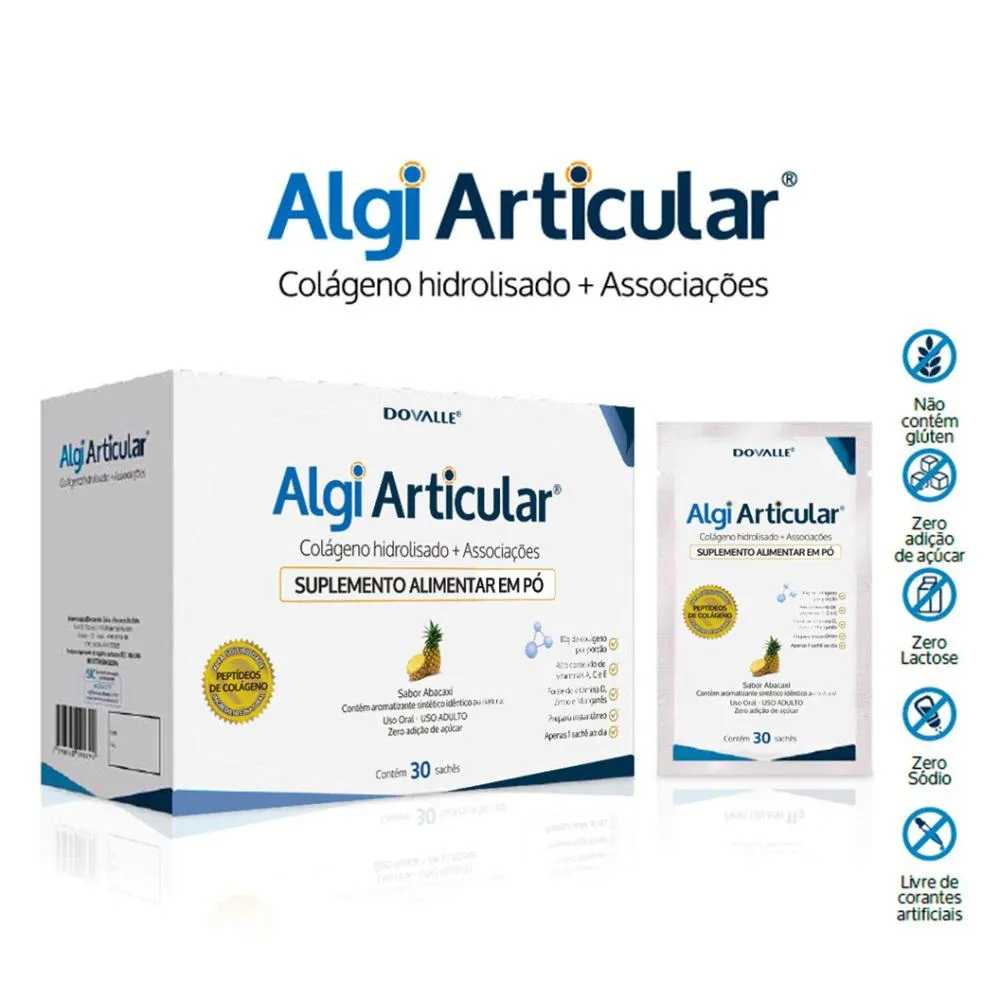 Suplemento Algi Articular Sabor Abacaxi 30 Sachês - Dovalle Algi Articular® é um suplemento alimentar em pó, para adultos e idosos, à base de colágeno