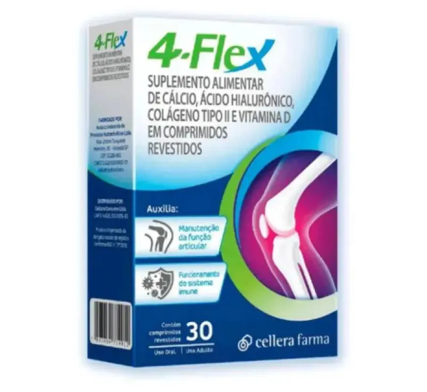 4-Flex colágeno 30 Comprimidos é um suplemento alimentar desenvolvido para auxiliar na saúde das articulações. Com colágeno hidrolisado tipo II, contribui para a manutenção da cartilagem, promovendo mais mobilidade e conforto nas atividades do dia a dia.Benefícios: