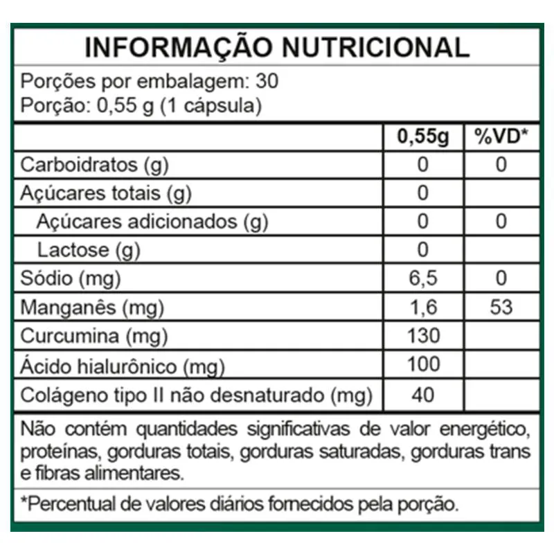 É um suplemento alimentar em cápsula que reúne a cúrcuma, ácido hialurônico, colágeno tipo II não desnaturado e manganês.¹
