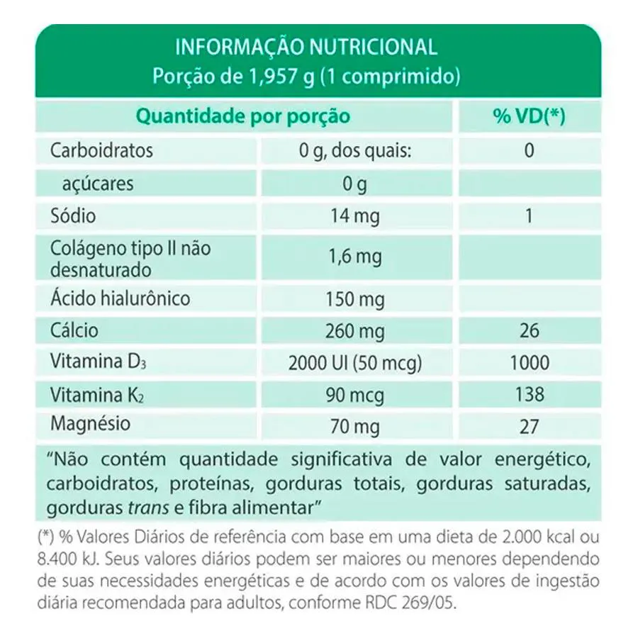- Colágeno tipo II não desnaturado (1,6 mg): Ajuda na manutenção da integridade das cartilagens.