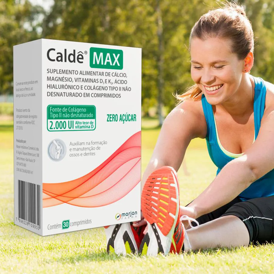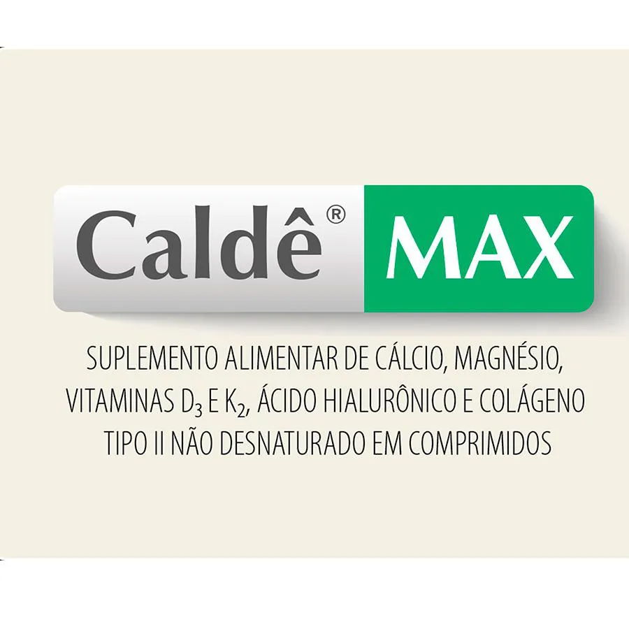 O Caldê Max é um suplemento alimentar desenvolvido para auxiliar na manutenção da saúde óssea e articular. Sua fórmula avançada combina cálcio, magnésio, vitaminas D₃ e K₂, ácido hialurônico e colágeno tipo II não desnaturado, nutrientes essenciais que contribuem para a formação e manutenção de ossos, articulações e cartilagens. Composição por comprimido:- Cálcio (260 mg): Auxilia na formação e manutenção de ossos e dentes.