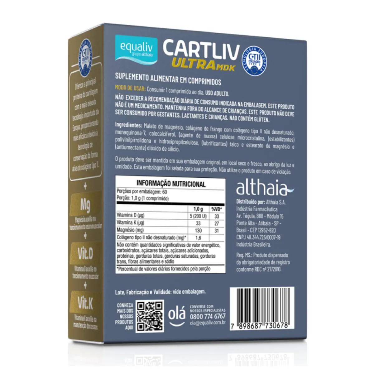 - Equaliv CartLiv Ultra é um suplemento com formulação específica voltada para a saúde das articulações, com Vitaminas D, K e Magnésio. - colágeno tipo II é o tipo de colágeno predominante na cartilagem das articulações. - Com o envelhecimento e/ou prática de atividades de impacto constante, ocorre o desgaste da cartilagem. - Isso provoca atrito entre os ossos resultando em dor e inflamação. As vitaminas K2 e D3 e o Magnésio são nutrientes fundamentais para o organismo. - Atuando diretamente no auxílio da função muscular e neuromuscular, no metabolismo energético e manutenção da saúde óssea. - Modo de uso: Consumir 1 comprimido ao dia. USO ADULTO. Contém 60 comprimidos.