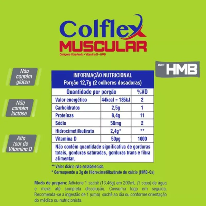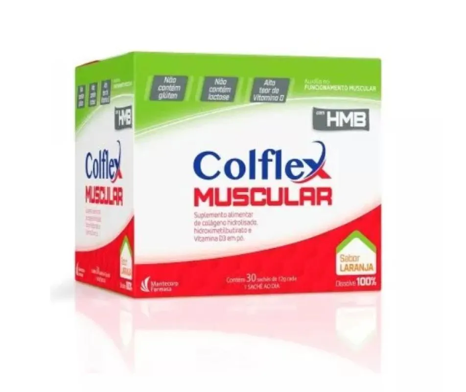 O Colflex Muscular Sabor Laranja é um suplemento alimentar para adultos praticantes de atividades físicas que auxilia no funcionamento muscular. Sua formula é composta por colágeno hidrolisado, hidroximetilbutirato (HMB) e vitamina D3.
