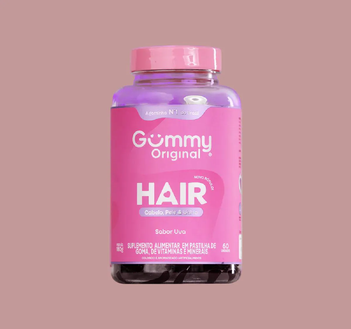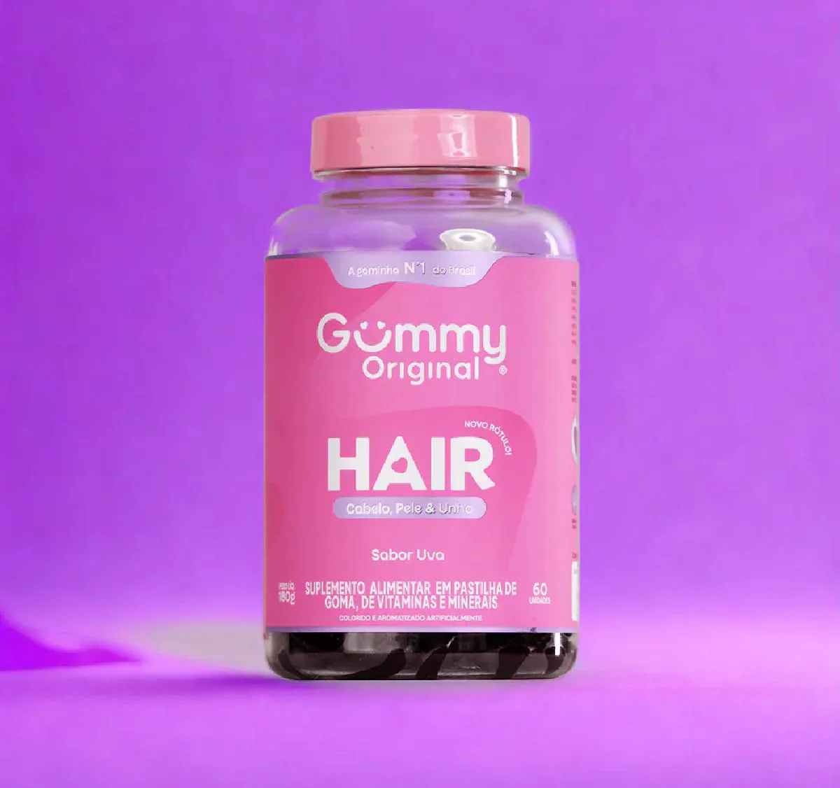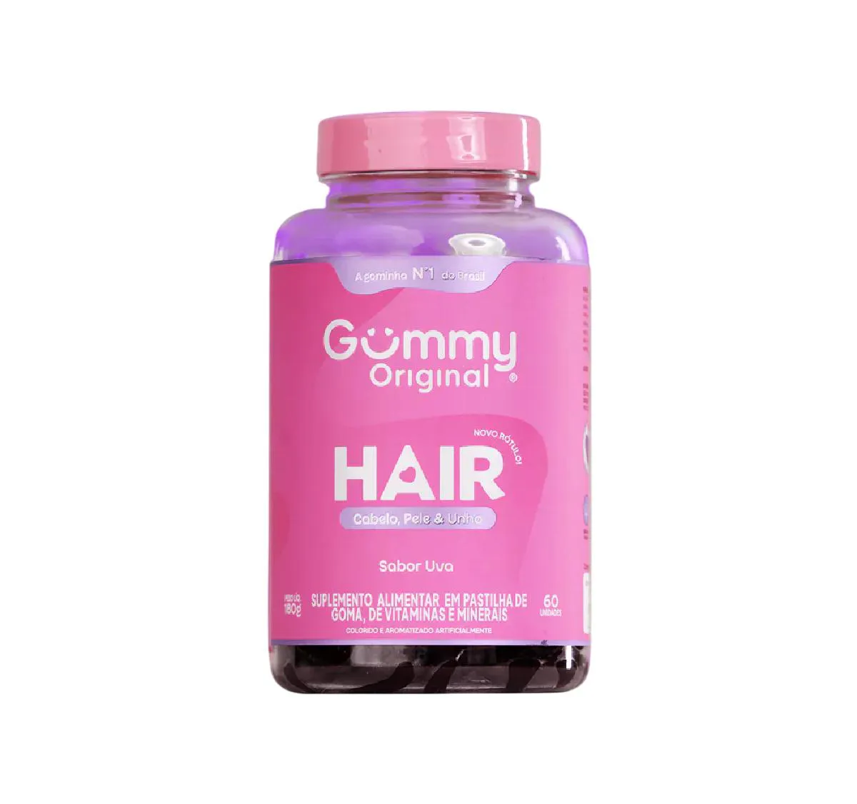Suplemento Alimentar Gummy Hair cabelo Pele E Unha Sabor Uva Com 60 Gomas - Gummy Uma nutrição equilibrada tem um papel muito importante na qualidade de vida. Com o ritmo acelerado de muitas pessoas, às vezes, é muito difícil prestar atenção a todos os requisitos que o corpo precisa para estar saudável e forte. Neste sentido, os suplementos cumprem a função de complementar a alimentação e ajudam a obter as vitaminas, minerais, proteínas e outros componentes indispensáveis para o correto funcionamento do organismo. Composição: Açúcar, xarope de glicose, vitamina c (ácido ascórbico), vitamina e (acetato de DL-alfa tocoferila), vitamina B5 (d-pantotenato de cálcio), Vitamina B6 (cloridrato de piridoxina), zinco (óxido de zinco), Vitamina A (palmitato de retinol), Vitamina B9 (ácido N-Pteroil I-Glutâmico), iodo (iodeto de potássio), Vitamina K1 (fitomenadiona), Vitamina H (d-biotina), cromo (picolinato de cromo), Vitamina D2 (ergocalciferol), agente de brilho (óleo vegetal e glaceante cera de carnaúba) estabilizante maltitol, gelificante pectina, acidulante ácido cítrico, regulador de acidez citrato de sódio, aromatizantes, corantes artificiais vermelho allura Ac e azul brilhante FCF.ALÉRGICOS: PODE CONTER LEITE, SOJA E PEIXES. NÃO CONTÉM GLÚTEN. Recomendação: Consumir 2 unidades ao dia. Recomendado para maiores de 19 anos.