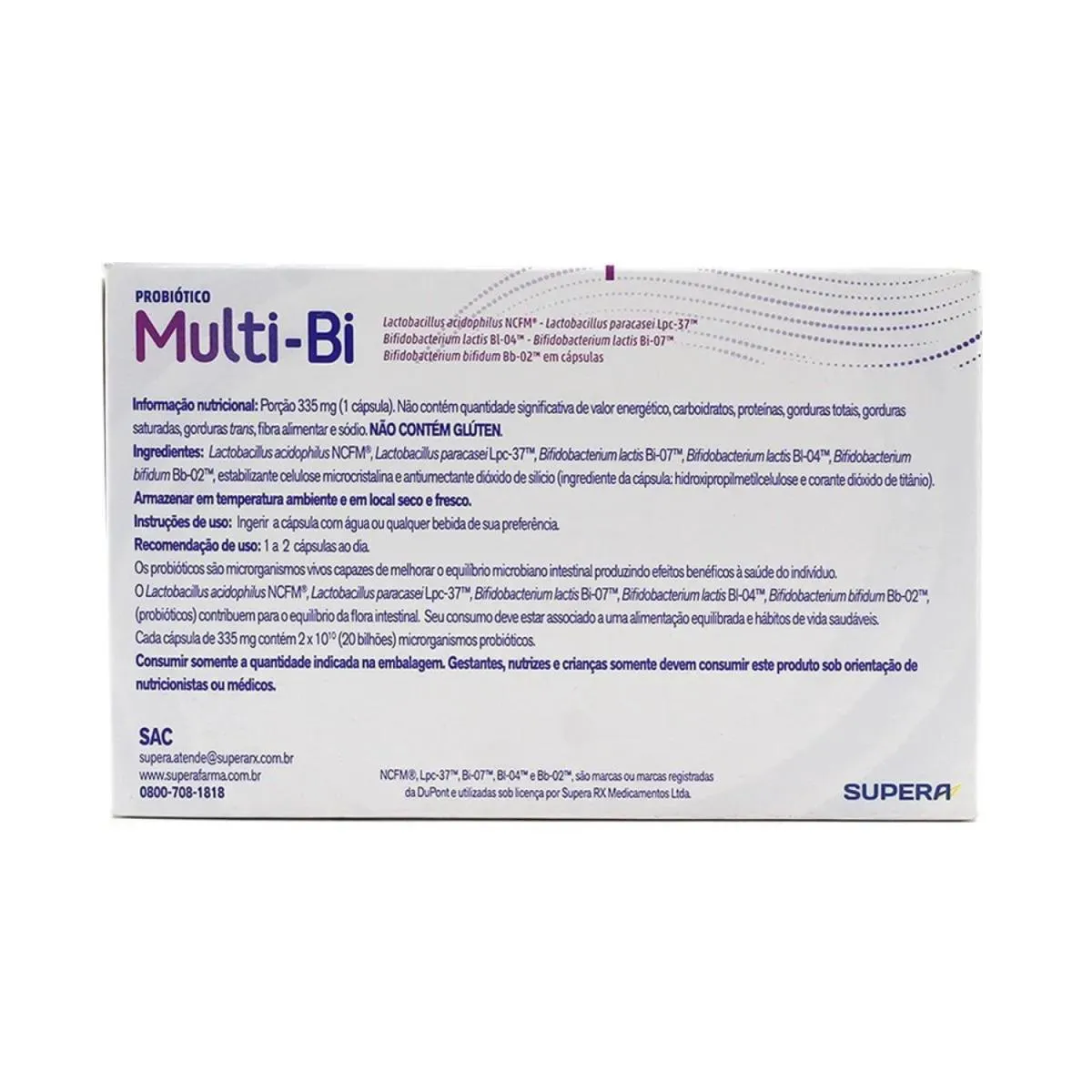 - Multi-Bi Probiótico 495mg 10 Cápsulas é um suplemento alimentar que combina diferentes cepas de probióticos para promover a saúde intestinal. - Indicado para melhorar a flora intestinal, fortalecer o sistema imunológico e auxiliar na digestão, Multi-Bi é uma solução eficaz para manter o equilíbrio do seu organismo. - O principal ativo é a combinação de probióticos, contendo várias cepas de Lactobacillus e Bifidobacterium. - Excipientes: maltodextrina, estearato de magnésio, dióxido de silício e cápsula de gelatina. - Tomar uma cápsula por dia, preferencialmente com uma refeição. - Conservar em local fresco e seco. Manter fora do alcance de crianças.