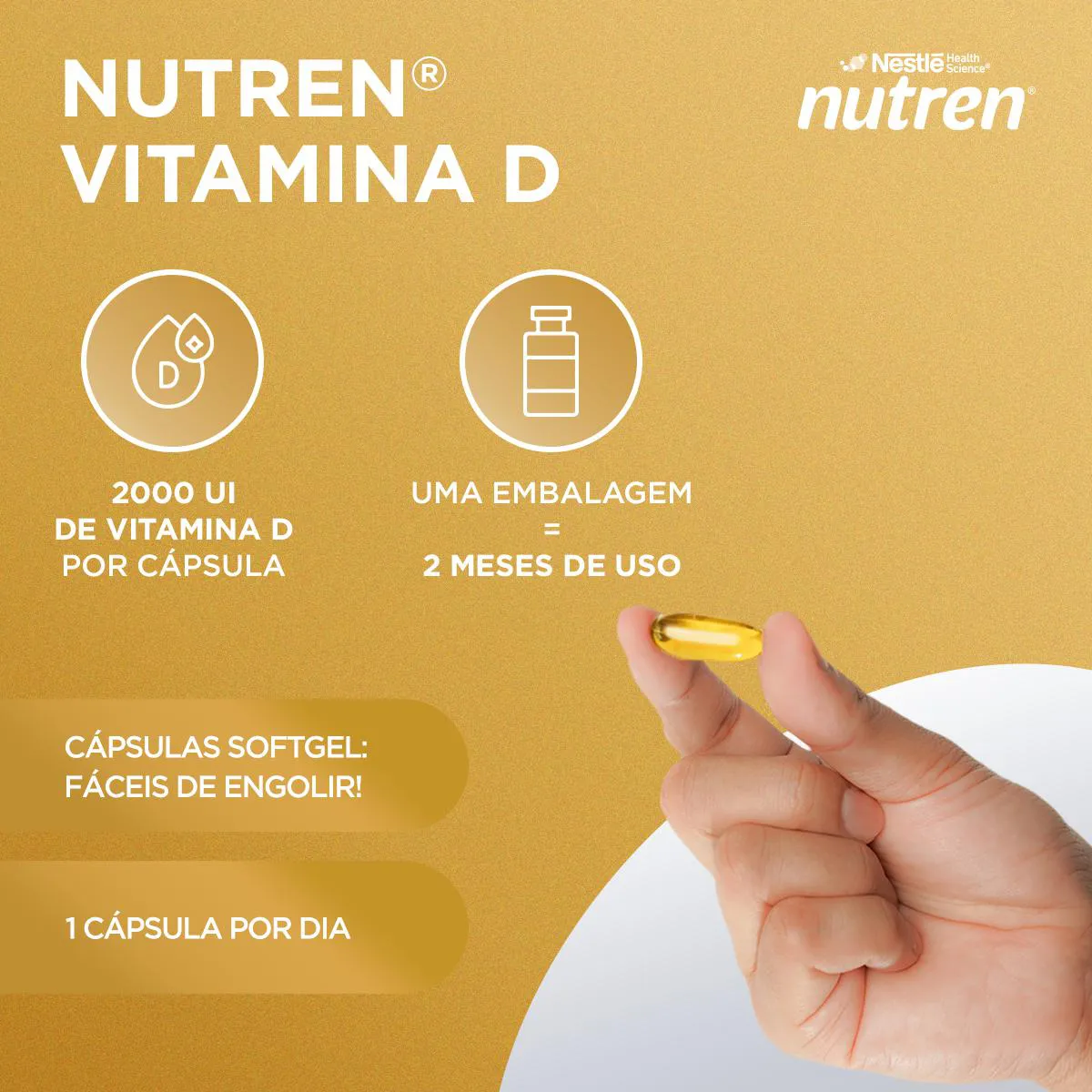 Suplemento alimentar de vitamina d em cápsulas, para que contribui para a imunidade e a saúde de ossos e músculos.**A vitamina D auxilia no funcionamento do sistema imune, no funcionamento muscular e na formação de ossos e dentes.