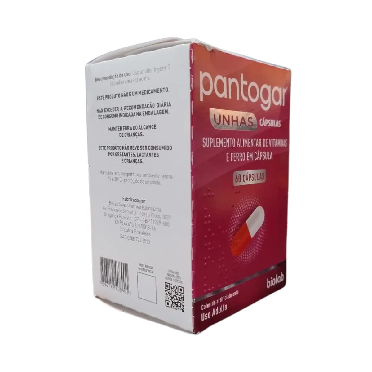 Pantogar Unhas é um suplemento alimentar desenvolvido para fortalecer e revitalizar unhas fracas e quebradiças, que podem ser resultado de deficiências nutricionais. Formulado com proteína de arroz, vitaminas e ferro, oferece os nutrientes essenciais para promover o crescimento saudável e a resistência das unhas. Com a expertise da renomada marca Pantogar, conhecida pelo cuidado capilar, este produto agora amplia sua atuação para a saúde e beleza das unhas, ajudando a restaurar sua vitalidade e brilho natural. Como usar: Tomar 2 cápsulas por dia, conforme orientação do médico ou nutricionista. Para melhores resultados, o uso contínuo é recomendado. Cuidados: O produto deve ser mantido fora do alcance de crianças. Armazene em local seco e arejado, longe de luz solar direta e calor excessivo. Fabricante: Biolab