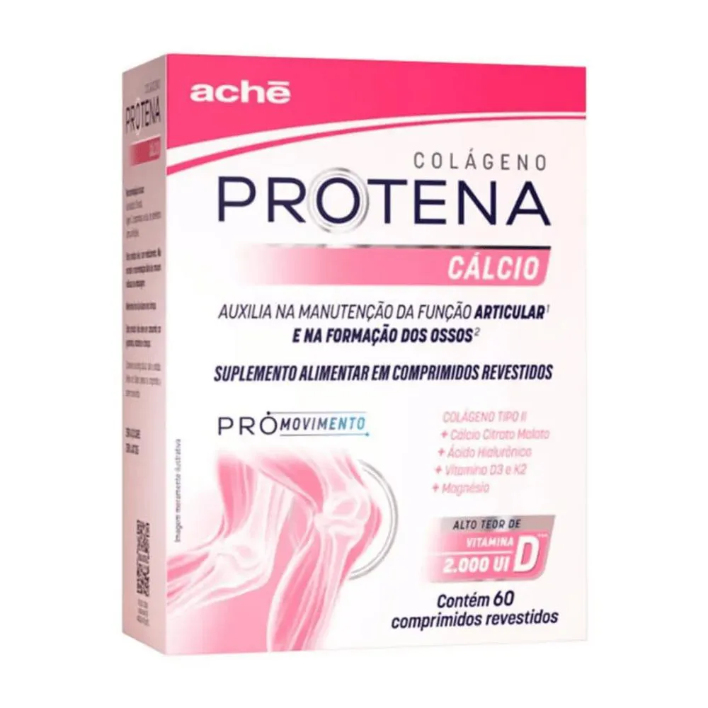 Protena Cálcio é um suplemento alimentar composto por Cálcio Citrato Malato, Ácido Hialurônico, Vitaminas D3 e K2 e Magnésio.