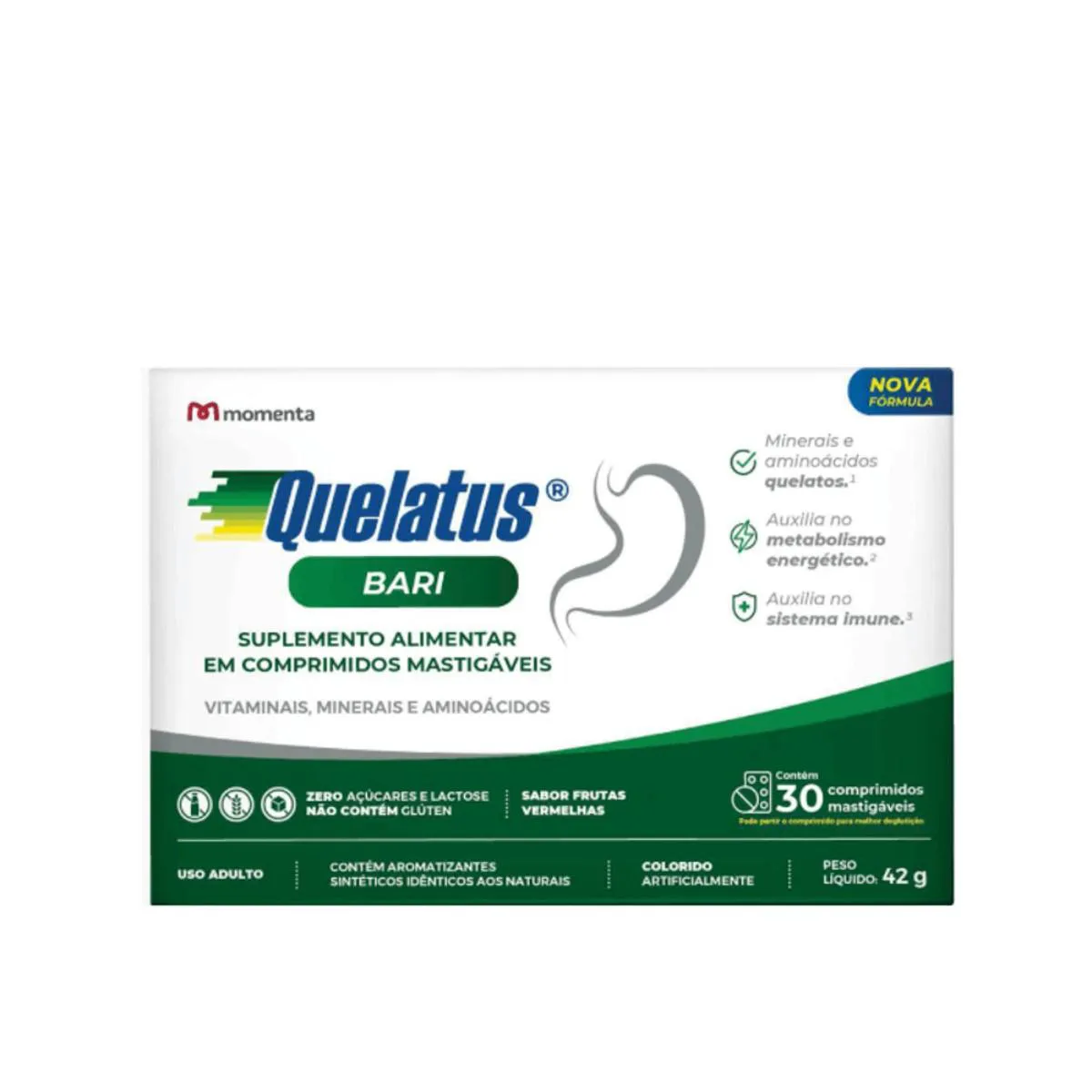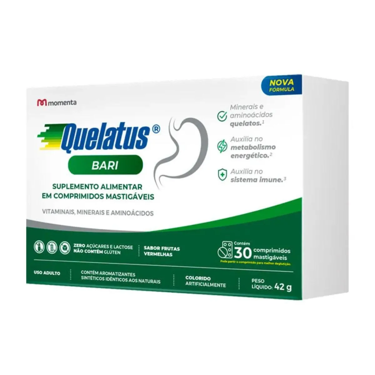 Quelatus Bari é um suplemento vitamínico-mineral que ajuda a complementar dietas irregulares ou com falta de algum nutriente. Ele também é indicado para pessoas que fizeram procedimento bariátrico. Quelatos Bari também é importante para metabolizar gorduras, proteínas e carboidratos. Sua fórmula atende as necessidades nutricionais do organismo feminino e masculino e conta com minerais aminoácidos quelatos. Queatos são minerais de última geração desenvolvidos especialmente para nutrição humana e com melhor absorção pelo organismo comparado aos minerais não quelatados. Sua apresentação em comprimidos mastigáveis permite fácil administração, no sabor de frutas vermelhas.