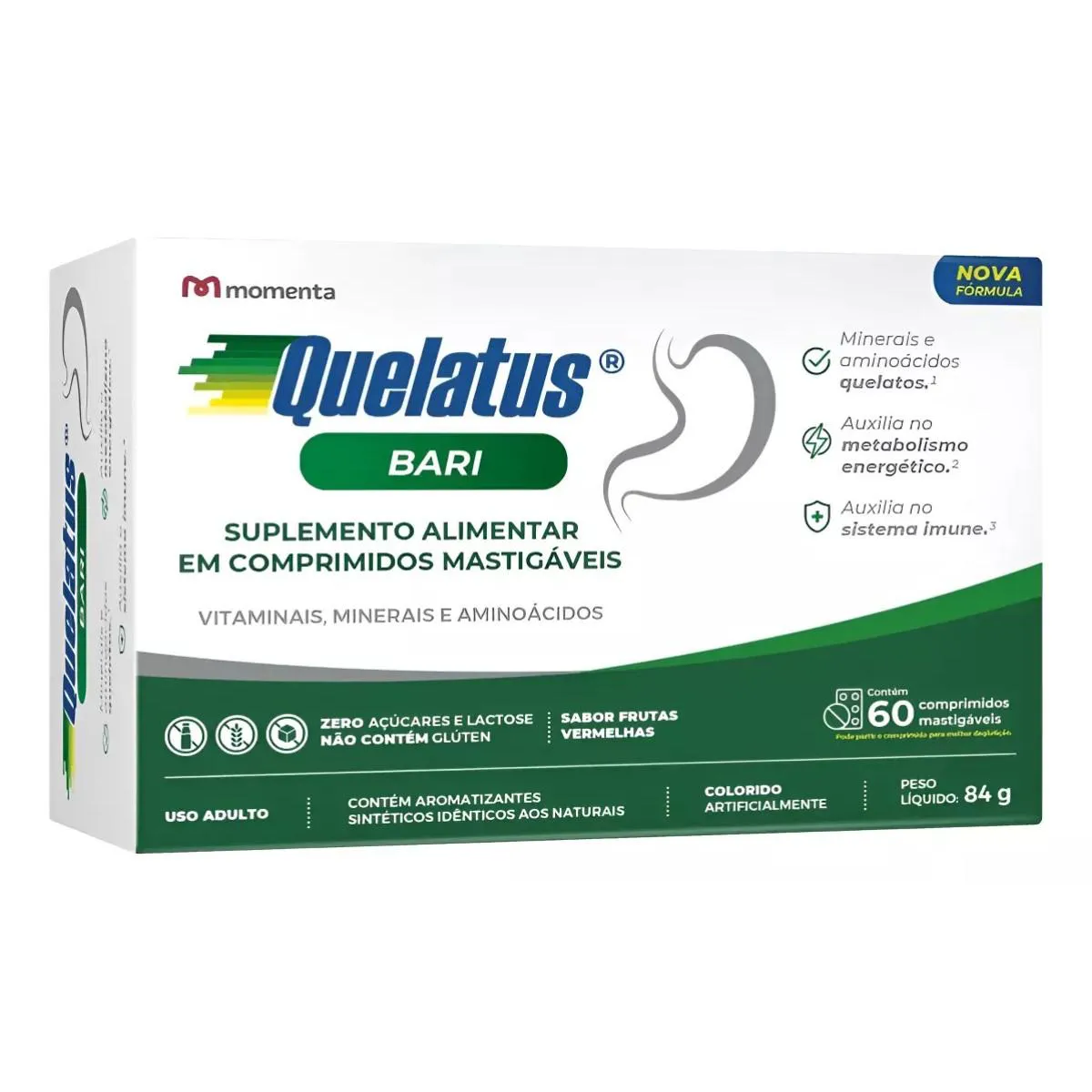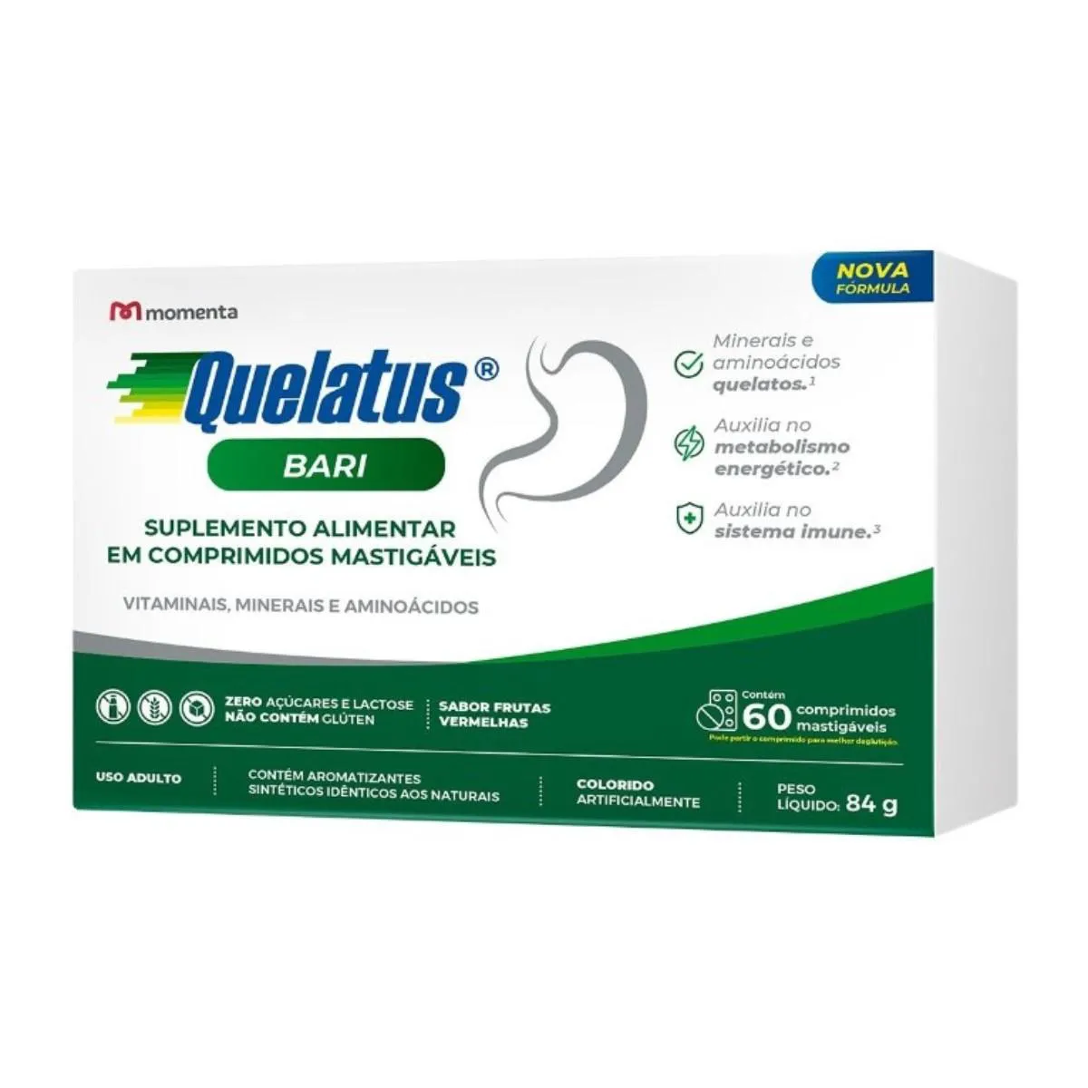 Quelatus Bari é um suplemento vitamínico-mineral que ajuda a complementar dietas irregulares ou com falta de algum nutriente. Ele também é indicado para pessoas que fizeram procedimento bariátrico. Quelatos Bari também é importante para metabolizar gorduras, proteínas e carboidratos. Sua fórmula atende as necessidades nutricionais do organismo feminino e masculino e conta com minerais aminoácidos quelatos. Queatos são minerais de última geração desenvolvidos especialmente para nutrição humana e com melhor absorção pelo organismo comparado aos minerais não quelatados. Sua apresentação em comprimidos mastigáveis permite fácil administração, no sabor de frutas vermelhas.