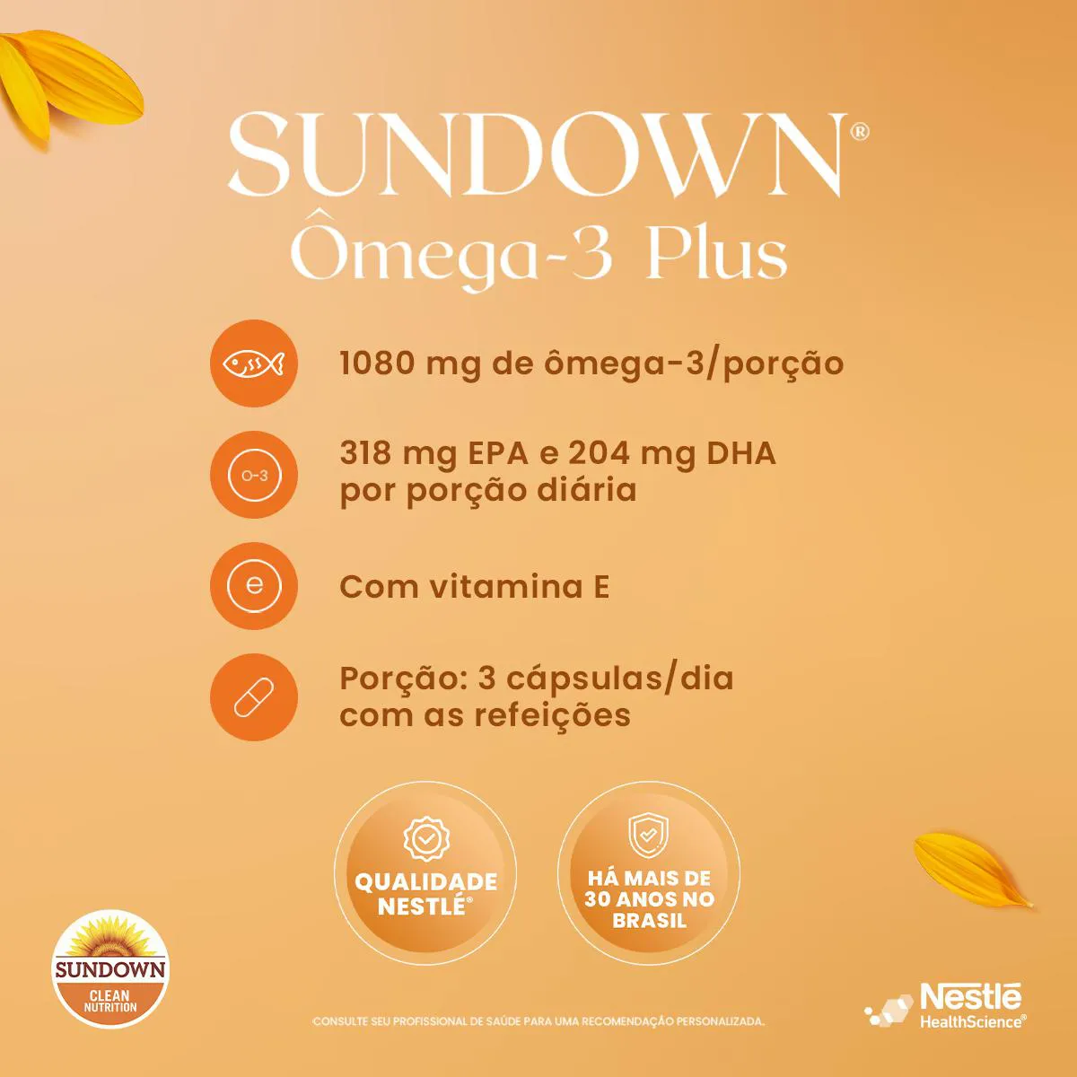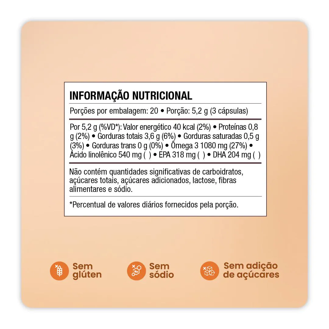 Suplemento alimentar em cápsulas que combina óleo de peixe, óleo de linhaça e vitamina e para auxiliar na ingestão diária de nutrientes.