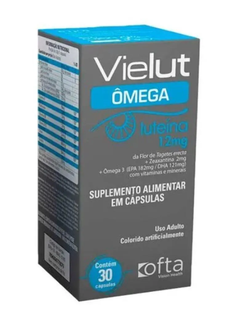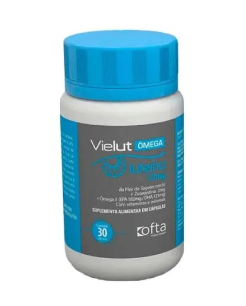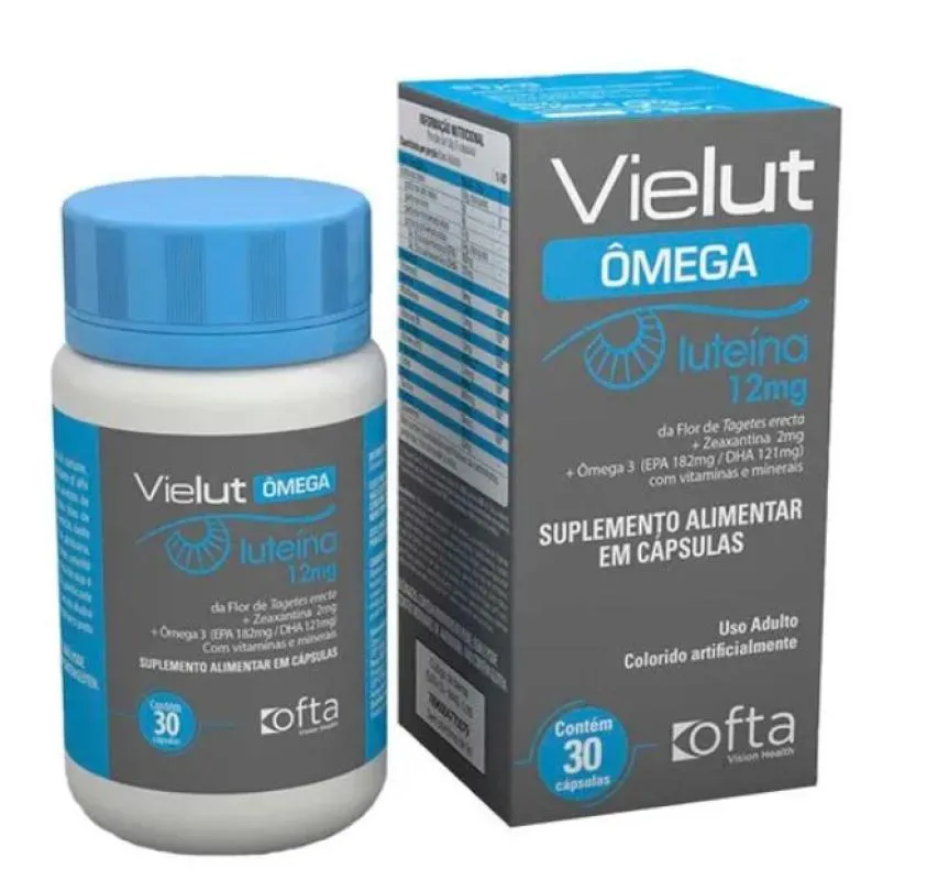 Vielut Ômega é um suplemento alimentar em cápsula composto por Luteína 12mg, Zeaxantina 2mg, Ômega 3 (EPA 182mg / DHA 121mg), Vitaminas e minerais.