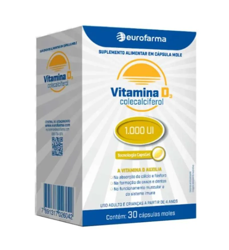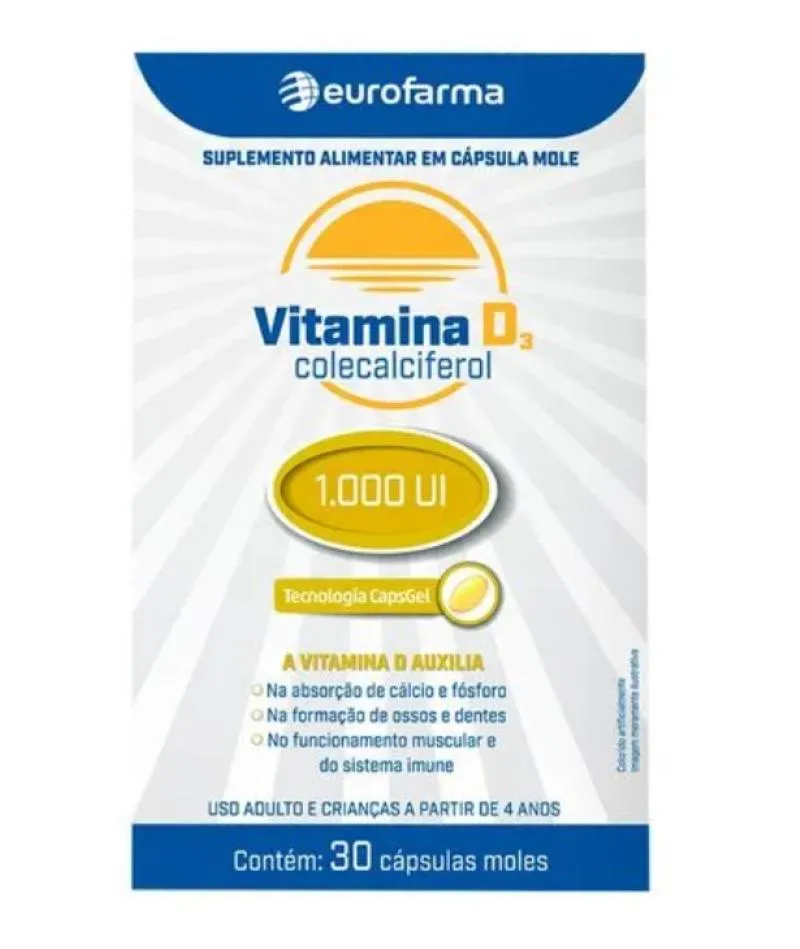 O Suplemento Alimentar Vitamina D3 Eurofarma é um produto em cápsulas moles contendo colecalciferol 1.000 UI, desenvolvido com tecnologia CapsGel. Serve para auxiliar na absorção de cálcio e fósforo, contribuir para a formação de ossos e dentes, e apoiar o funcionamento muscular e do sistema imunológico.