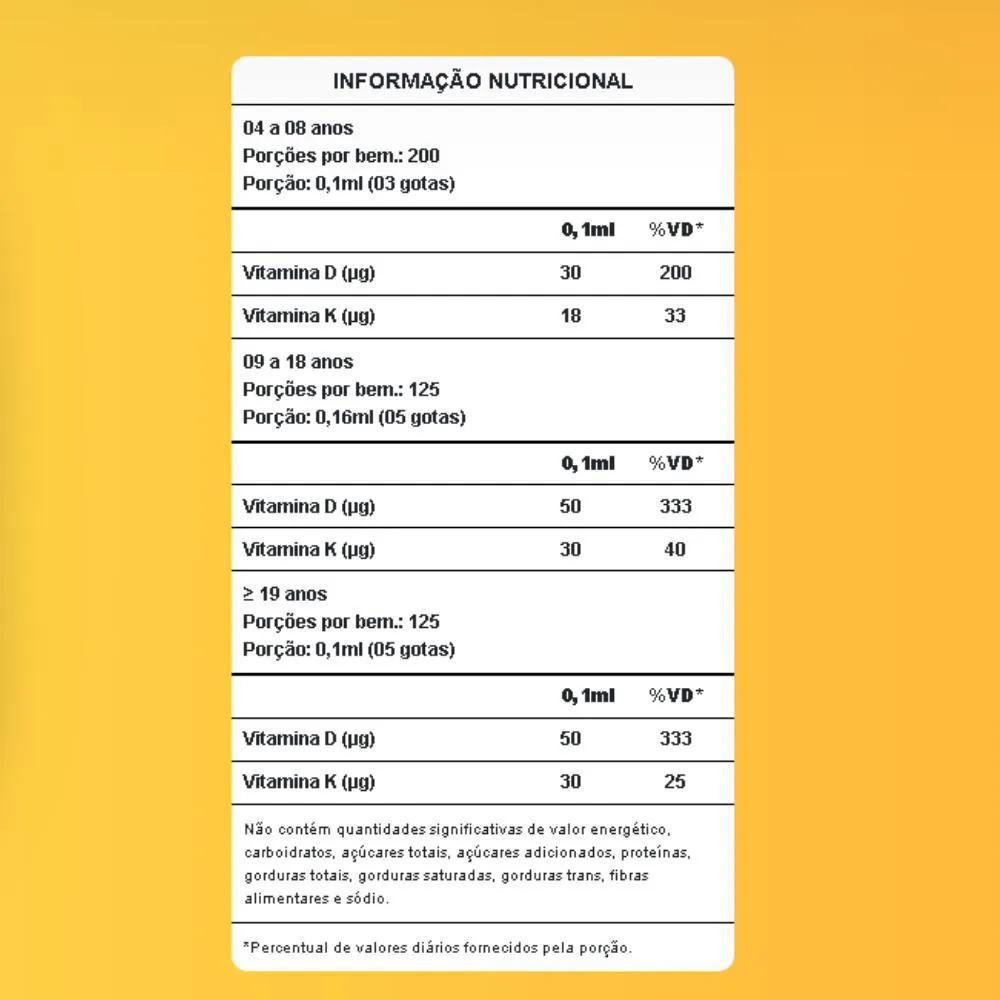 Kit 2 Suplemento Bio Vit D3+K2 Em gotas Sabor Limão 20ml – Puravida A nova vitamina D3 + K2 EM GOTAS foi pensada para ser usada por todos: adultos, crianças, idosos, pessoas de todas as idades com dificuldade em ingerir cápsulas, e também que buscam uma dosagem individualizada e flexível. Principais Componentes e Seus Benefícios: A vitamina d auxilia no funcionamento do sistema imune. Este fato foi confirmado pela meta-análise publicada em 2019 pela Health Technology Assessment, que estabeleceu a ação estrutural benéfica da Vitamina D para diferentes aspectos da imunidade. Sem vitamina D, a imunidade não funciona como deveria, e o corpo sofre mais em qualquer cenário. Este nutriente também participa da absorção e regulação do cálcio e do fósforo na corrente sanguínea e ajuda a fixar o cálcio nos ossos, sendo indispensável para a boa formação óssea na infância e para uma boa densidade óssea na idade adulta e madura. Mas, é de conhecimento no universo da nutrição que, em muitos casos, os nutrientes só podem funcionar adequadamente quando combinados com outros nutrientes, realizando aquilo que se conhece por sinergia. E acontece que o principal nutriente que faz sinergia com a vitamina D é outra vitamina do grupo das lipossolúveis: a vitamina K2. MODO DE USO: 4 a 8 anos: Ingerir 3 gotas ao dia. 9 a 18 anos: Ingerir 5 gotas ao dia. 19 anos ou mais: Ingerir 5 gotas ao dia. Em uma dose (5 gotas), você encontra 2000 UIs de vitamina D, e 30 mcg de vitamina K2 (menaquinona). Cada gota = 10mcg vit D = 400UI vit D. Cada gota = 6mcg vit K Evite utilizar após as 17h, pois a vitamina D compete com os receptores da melatonina, que é produzida à noite. COMPOSIÇÃO: Triglicerídeos de cadeia média, colecalciferol (vitamina D3), menaquinona-7 (vitamina K2), aroma natural de limão e antioxidante D-alfa-tocoferol. SOBRE A LOJA: Somos a rede de farmácias mais antiga de São José dos Pinhais, atuando no ramo farmacêutico desde 1990 com comprometimento à qualidade e satisfação do cliente. É um prazer compartilhar os nossos valores e as nossas conquistas com quem confia no nosso trabalho! Imagens dos Produtos são Meramente Ilustrativas. Todas as Informações Divulgadas são de Responsabilidade Exclusiva do Fabricante/fornecedor.