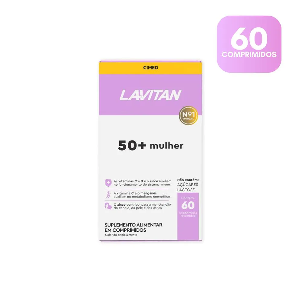 Suplemento Lavitan 50+ Mulher 60 Comprimidos – Cimed Desenvolvido para mulheres com 50 anos ou mais que desejam complementar a alimentação com vitaminas e minerais específicos. Composição principal: Contém diversas vitaminas e minerais, entre os quais: vitaminas do complexo B, vitaminas A, C, D, E, K; minerais como ferro, zinco, manganês, selénio.