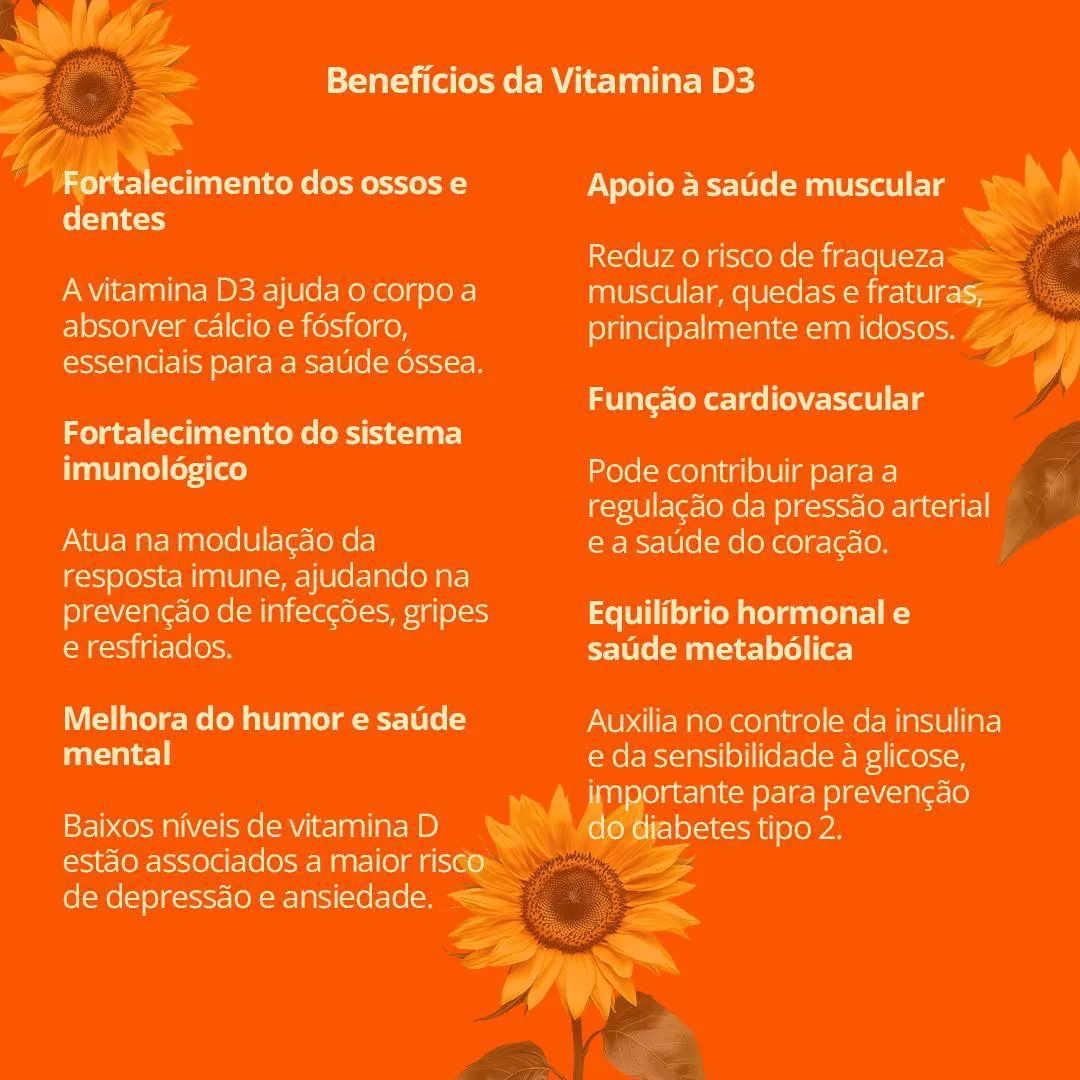 O Suplemento Vitamina D3 é um suplemento alimentar composto por colecalciferol (vitamina D3) em cápsulas, na dosagem de 2000UI por unidade. Trata-se de uma vitamina lipossolúvel essencial para processos fisiológicos do corpo humano. Serve para auxiliar na absorção intestinal de cálcio e fósforo, contribuir para a manutenção dos níveis séricos de cálcio, e apoiar o funcionamento do sistema imunológico e muscular. Destinado a adultos a partir de 19 anos, com recomendação de ingestão de 1 cápsula ao dia ou conforme orientação profissional.