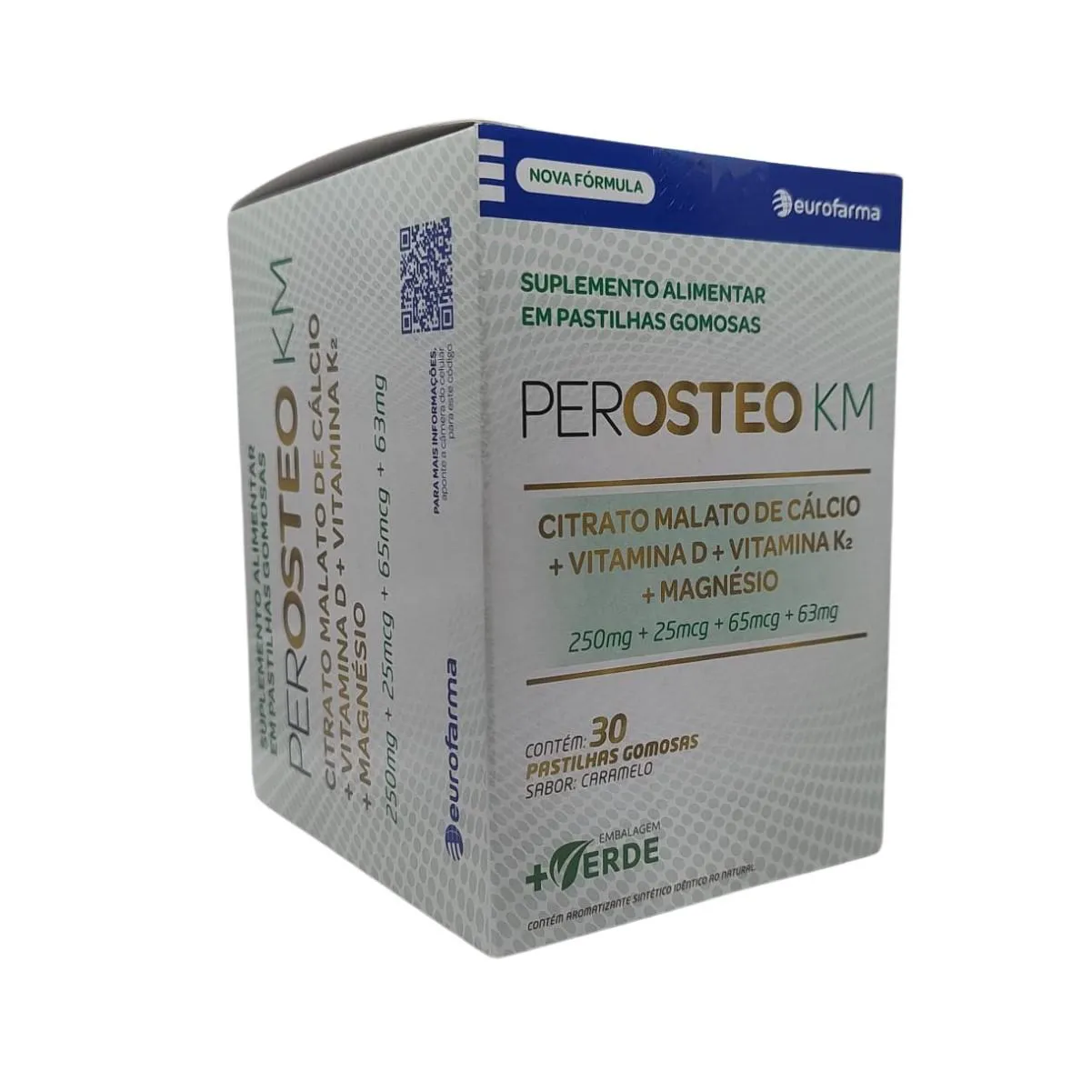 Perosteo KM é um suplemento vitamínico mineral que contribui para a saúde óssea dos adultos. É formulado com nutrientes essenciais que ajudam a prevenir a osteoporose e a reduzir o risco de fraturas, desde que associado a uma dieta equilibrada e hábitos de vida saudáveis. A caixa contém 30 tabletes mastigáveis sabor caramelo. Cálcio: - Contribui para formação e manutenção de ossos e dentes. - Atua na coagulação do sangue. - Auxilia para contração muscular e impulsos nervosos. Magnésio: - Essencial na atividade neuromuscular. - Age na mineralização do osso. - Atua para o bom funcionamento do hormônio da tireoide. vitamina d: - Absorção de cálcio e fósforo. - Ajuda a prevenir problemas ósseos e fraturas. vitamina K: - Relacionada à coagulação, transporte e fixação de cálcio. Fabricante: Eurofarma