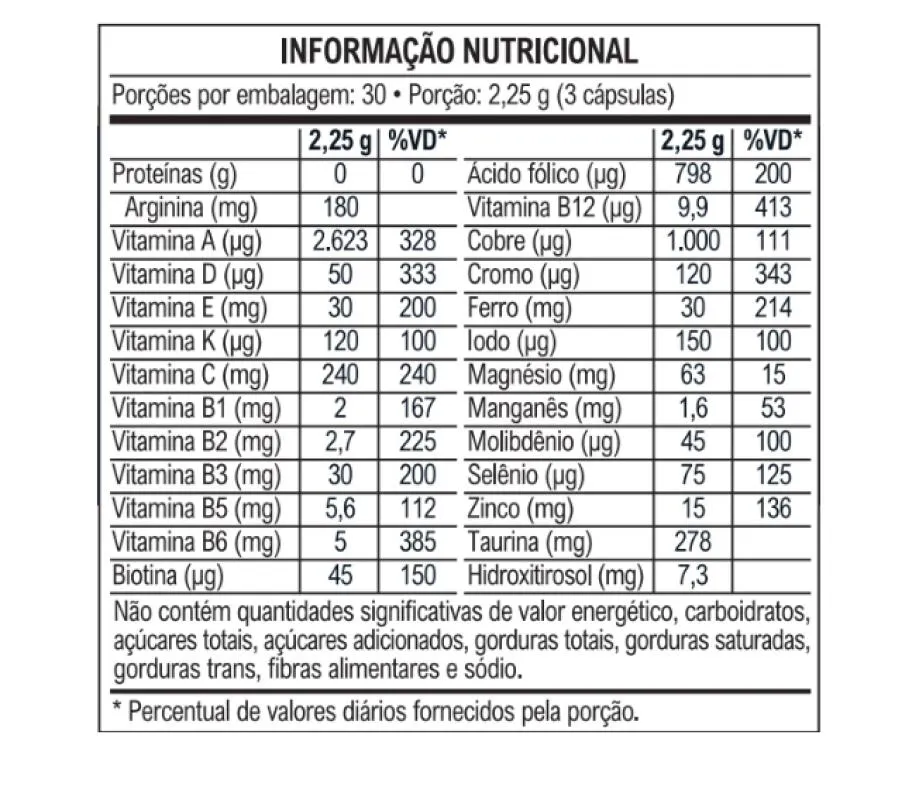Suplemento com combinação de vitaminas, minerais, taurina, arginina e extrato de oliva (Oli-Ola™). Fórmula ampla para uso diário, com nutrientes essenciais em cápsulas práticas. Destaques do produto:- Contém 13 vitaminas e 9 minerais.