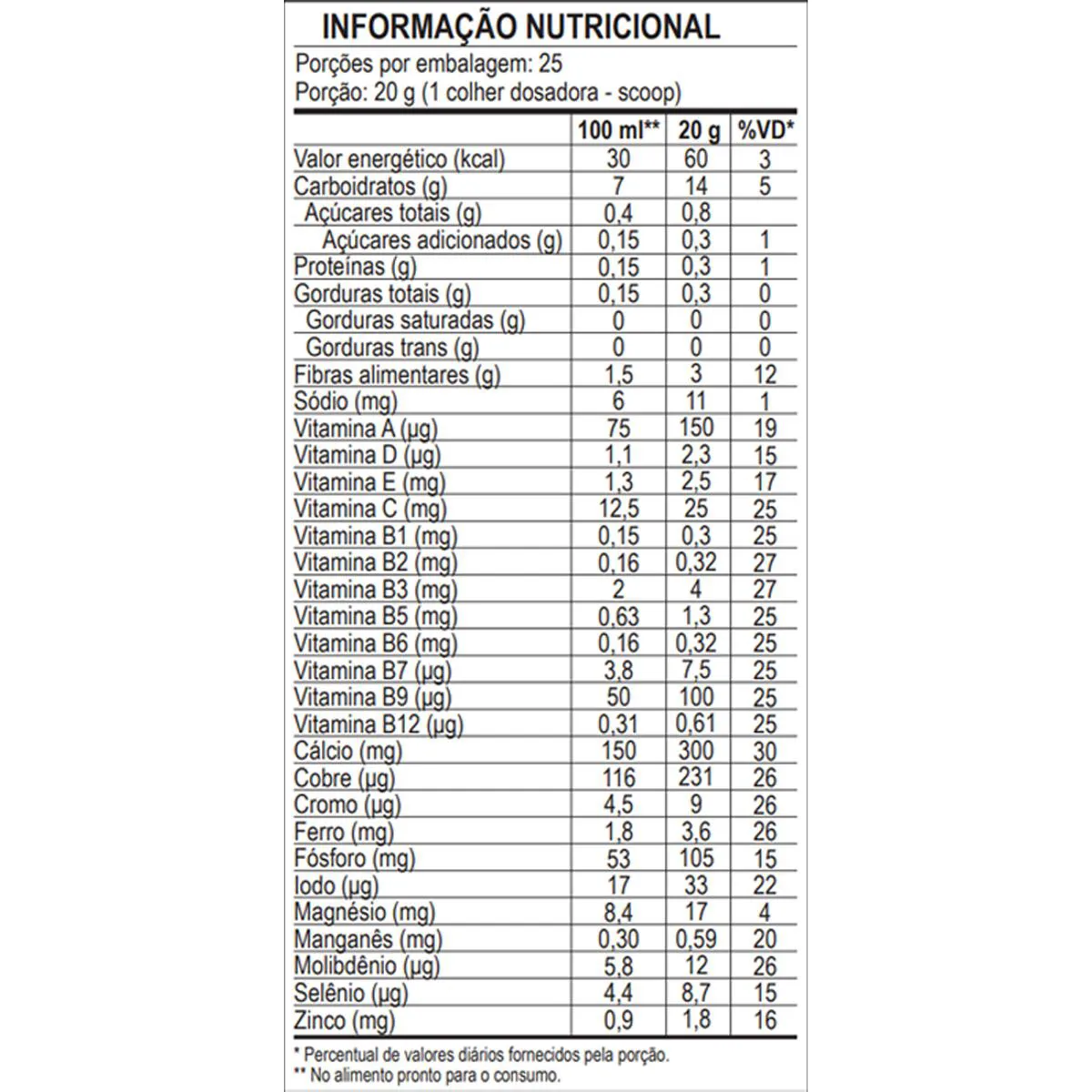 A Bebida de Arroz é uma ótima alternativa ao leite comum, especialmente para pessoas com intolerância alimentar. Rica em vitaminas, fibras e minerais. Indicado para substituição pelos leites vegetais (enriquecidos com cálcio e vitaminas). O leite de arroz é um dos melhores substitutos, principalmente a sua versão em pó, já que, além de enriquecida, também pode substituir o leite em receitas diversas, doces ou salgadas. Modo de preparo: Adicione 20 g (1 colher dosadora - scoop) em 200 ml de água. Mexer bem. Conserve o produto em temperatura ambiente entre 15°C a 30°C e em local seco e fresco, protegendo da luz e umidade. Após aberto, mantenha a embalagem bem fechada e consuma em até 55 dias. Esta embalagem vem lacrada, em caso de violação não utilize o produto. Produtos fora do prazo de validade não devem ser consumidos. Ingredientes: Arroz, maltodextrina, polidextrose, mix de minerais (fosfato de cálcio dibásico, pirofosfato férrico, sulfato de magnésio monoidratado, sulfato de zinco monoidratado, sulfato de manganês, sulfato cúprico, picolinato de cromo, molibdato de sódio diidratado, selenito de sódio e iodeto de potássio), carbonato de cálcio, fosfato tricálcico, mix de vitaminas (acetato de retinol, cloridrato de tiamina, riboflavina, niacinamida, D-pantotenato de cálcio, cloridrato de piridoxina, D-Biotina, ácido fólico, cianocobalamina, ácido ascórbico e acetato de DL-alfa-tocoferol), pó de cogumelo Agaricus bisporus contendo vitamina D2 tratados com radiação UV, aroma natural de baunilha, edulcorantes sucralose, glicosídeos de esteviol e taumatina e espessante carboximetilcelulose. Produto autorizado para comercialização em todo o território nacional através da RDC 719/2022 da ANVISA. AFE do MS 6.02234-1. NÃO CONTÉM GLÚTEN