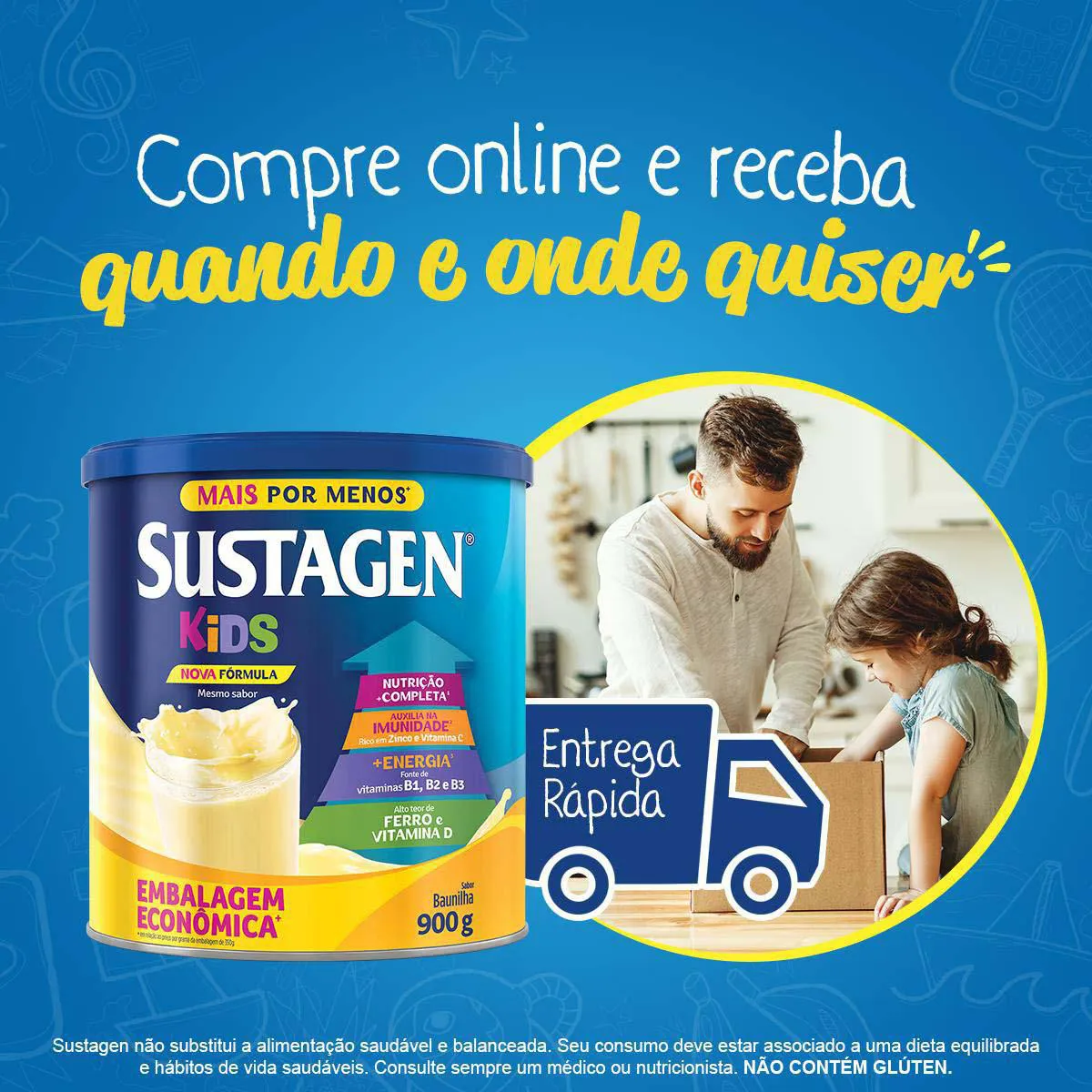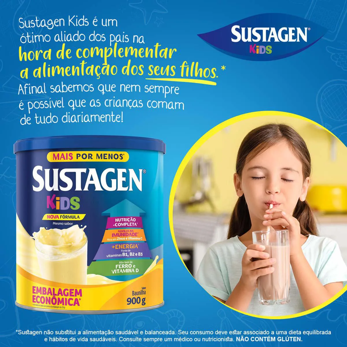 O Sustagen Kids é um complemento alimentar infantil composto por 27 vitaminas e minerais, desenvolvido para fornecer nutrição adicional para crianças acima de 3 anos de idade. Seu objetivo é auxiliar no fortalecimento nutricional, oferecendo vitaminas como A, C, D, E e do complexo B, que contribuem para o sistema de defesa e geração de energia da criança.