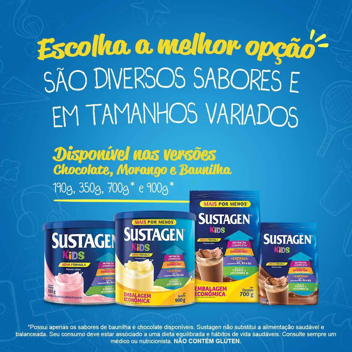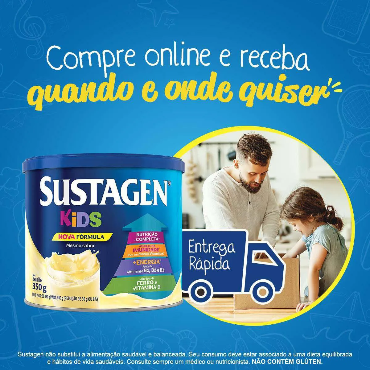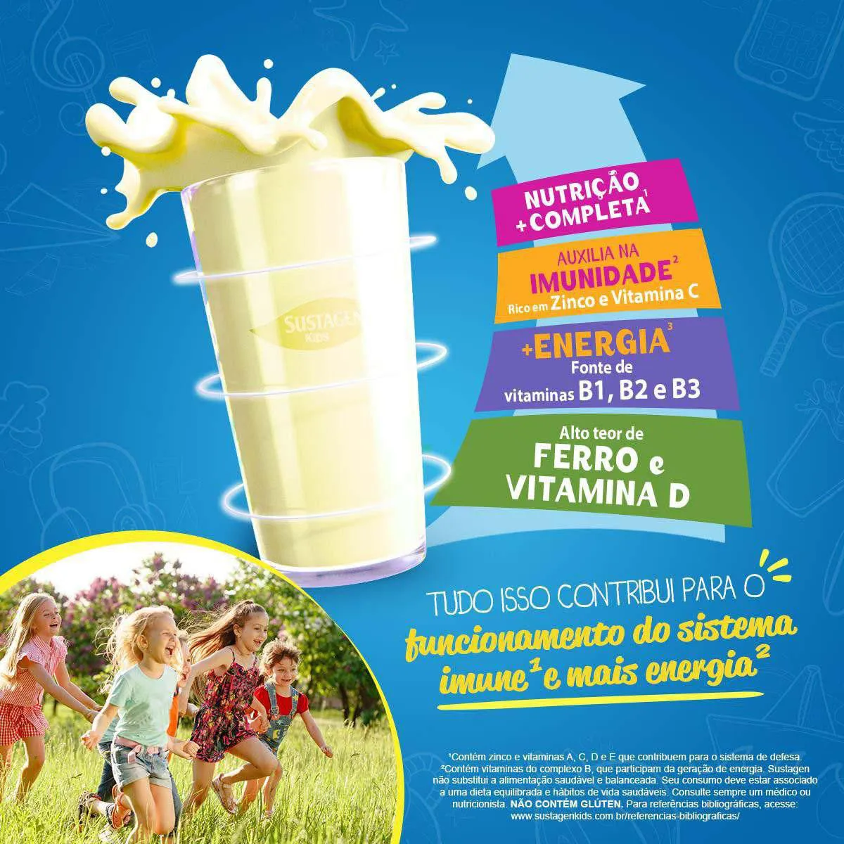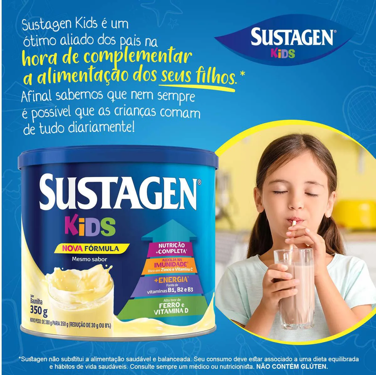 O Sustagen Kids é um complemento alimentar desenvolvido para fornecer nutrição adicional para crianças acima de 3 anos, contendo 26 vitaminas e minerais essenciais. Seu objetivo é auxiliar no fortalecimento nutricional infantil, contribuindo para o sistema de defesa, geração de energia e desenvolvimento adequado da criança, quando combinado com uma alimentação saudável e balanceada.