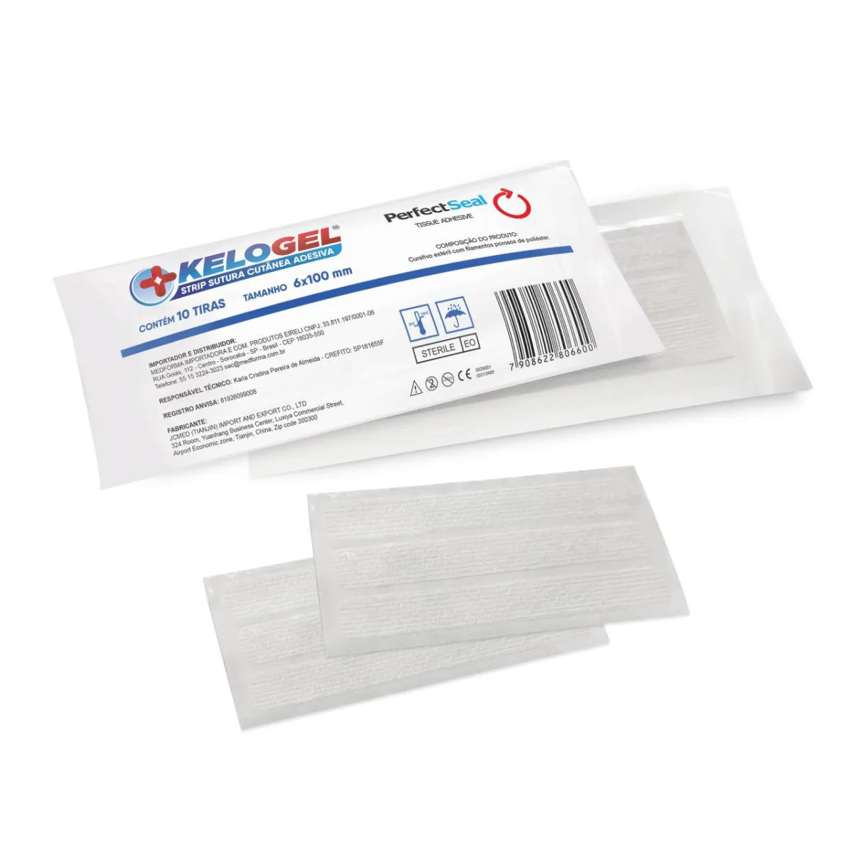 KELOGEL STRIP – SUTURA CUTANÊA ADESIVA O KELOGEL STRIP PERFECTSEAL é utilizado para fechamento de pele, substituindo métodos convencionais em lacerações e incisões cirúrgicas. Pode ser aplicado com suturas, grampos ou sozinho para suporte adicional pós-remoção. Composição do produto: Curativo estéril com filamentos porosos de poliéster. Indicações: Substituição de métodos tradicionais de fechamento em lacerações e incisões. Pode ser usado com suturas, grampos ou sozinho para suporte adicional pós-remoção. Modo de uso: