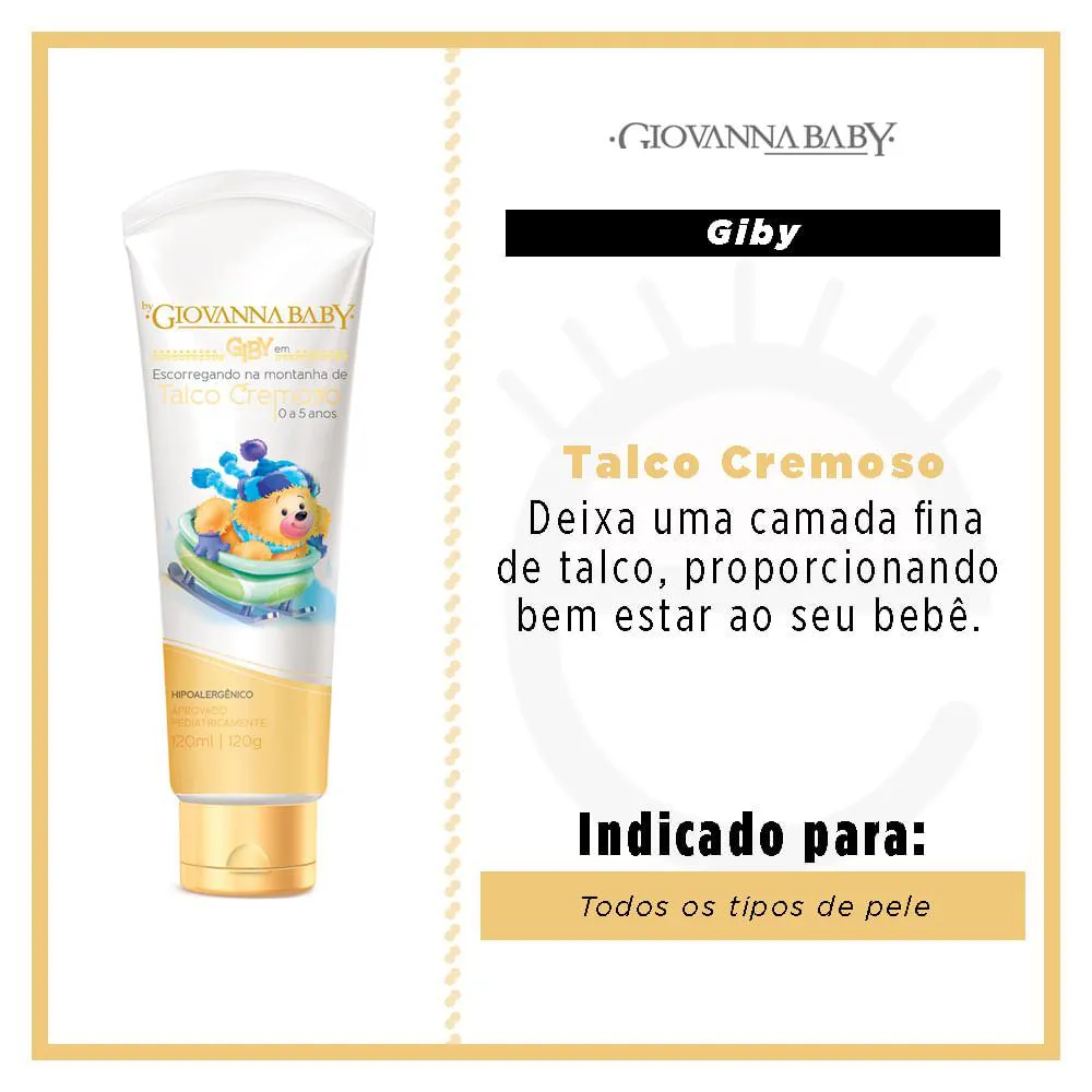 O Talco Cremoso Giby Giovanna Baby foi especialmente desenvolvido para a pele delicada do seu bebê. Possui o exclusivo ativo “Giby Care”: Uma fórmula cuidadosamente enriquecida com extrato de coco, que promove hidratação natural; extrato de algodão, com propriedades emolientes, e “mel vegetal”, com propriedades nutritivas. Sua fórmula é rapidamente absorvida, deixando uma camada fina de talco, proporcionando bem estar ao seu bebê. A linha Giovanna Baby possui produtos não testados em animais, livre de corantes, não irritam a pele e são testados dermatologicamente.