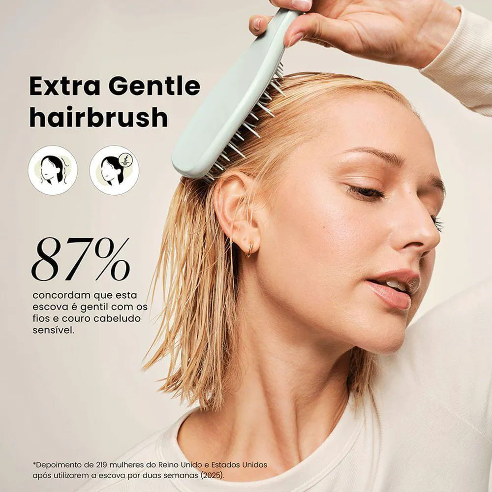 O Tangle Teezer The Ultimate Detangler Extra Gentle - Green é uma escova desembaraçadora projetada para cabelos extremamente delicados, com alta queda ou propensos a quebras, como cabelos finos, frágeis, quimicamente tratados ou pós-quimioterapia. Lançada pela Tangle Teezer, apresenta cerdas soft-flex com padrão de dentes espaçados nas bordas e mais concentrados no centro, reduzindo a tensão e minimizando a quebra. Ideal para cabelos molhados ou secos, seu design ergonômico com cabo fino facilita o uso no banho, distribuindo produtos como shampoos, condicionadores e máscaras. Fabricada na Grã-Bretanha, na cor verde eucalipto, a escova é reciclável, vegana e promove cabelos macios, brilhantes e sem frizz, sendo especialmente gentil para couros cabeludos sensíveis.