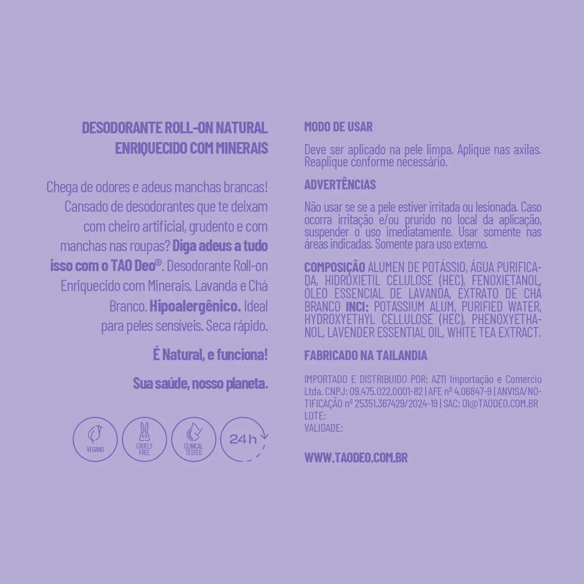 - Desodorante Natural TAO Deo Roll-On Lavanda e Chá Branco é um produto usado para neutralizar odores corporais naturalmente.