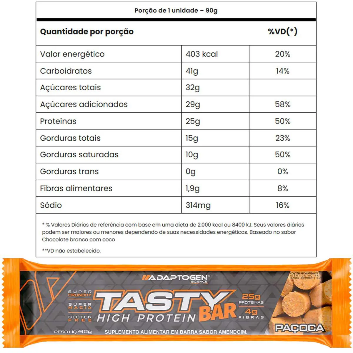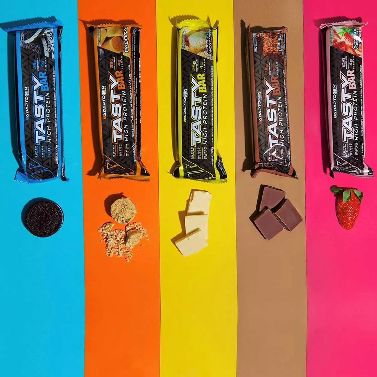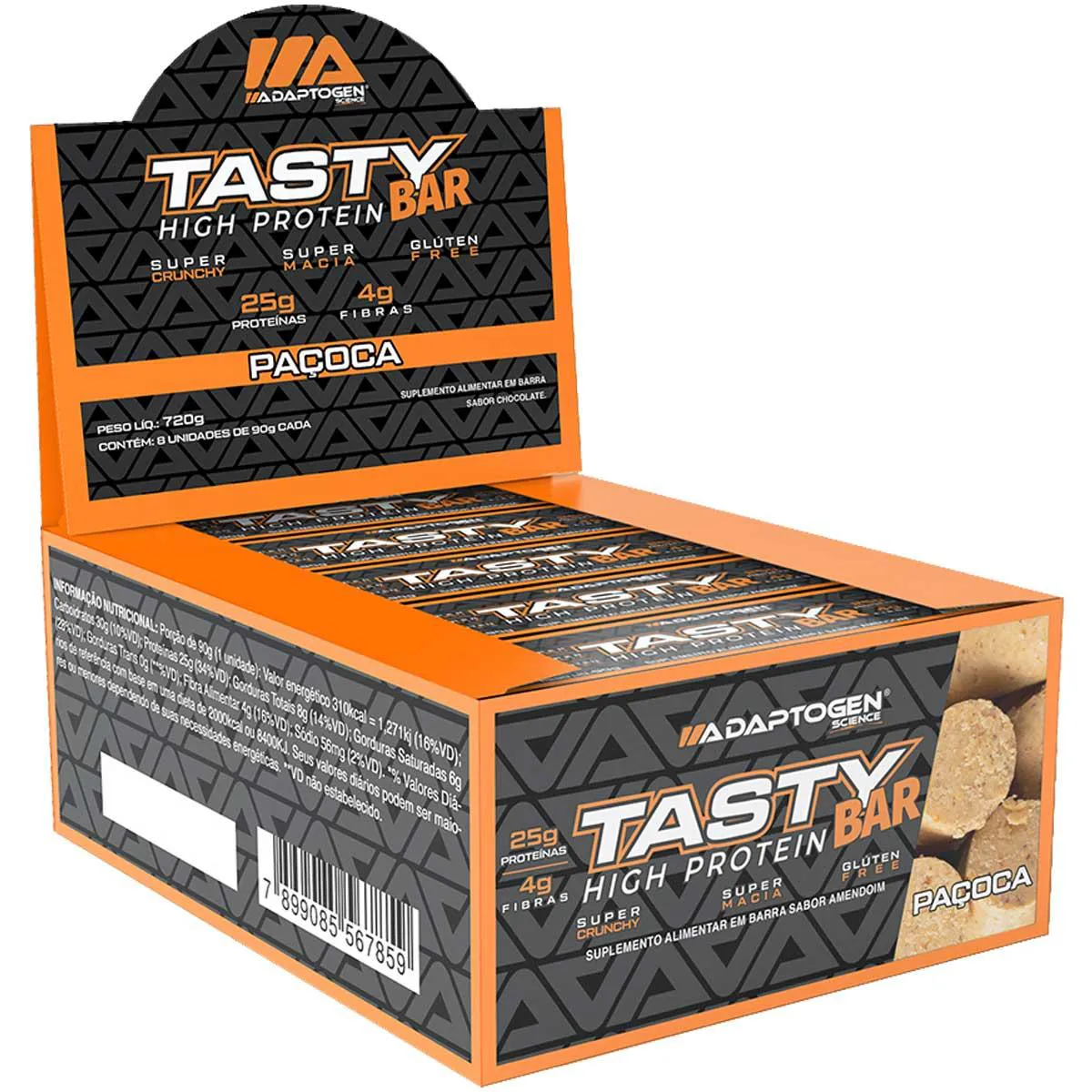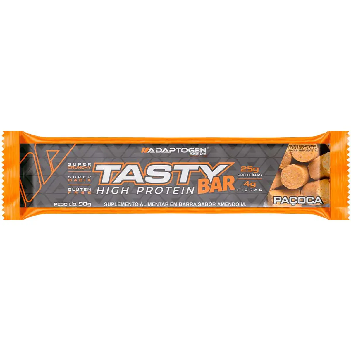 O Tasty Bar é uma barra de cereais proteica desenvolvida pela marca Adaptogen, com sabor de chocolate branco, livre de glúten. Cada caixa contém 8 unidades de 90g, totalizando 784g de produto. Trata-se de um suplemento alimentar destinado a complementar a dieta nutricional.