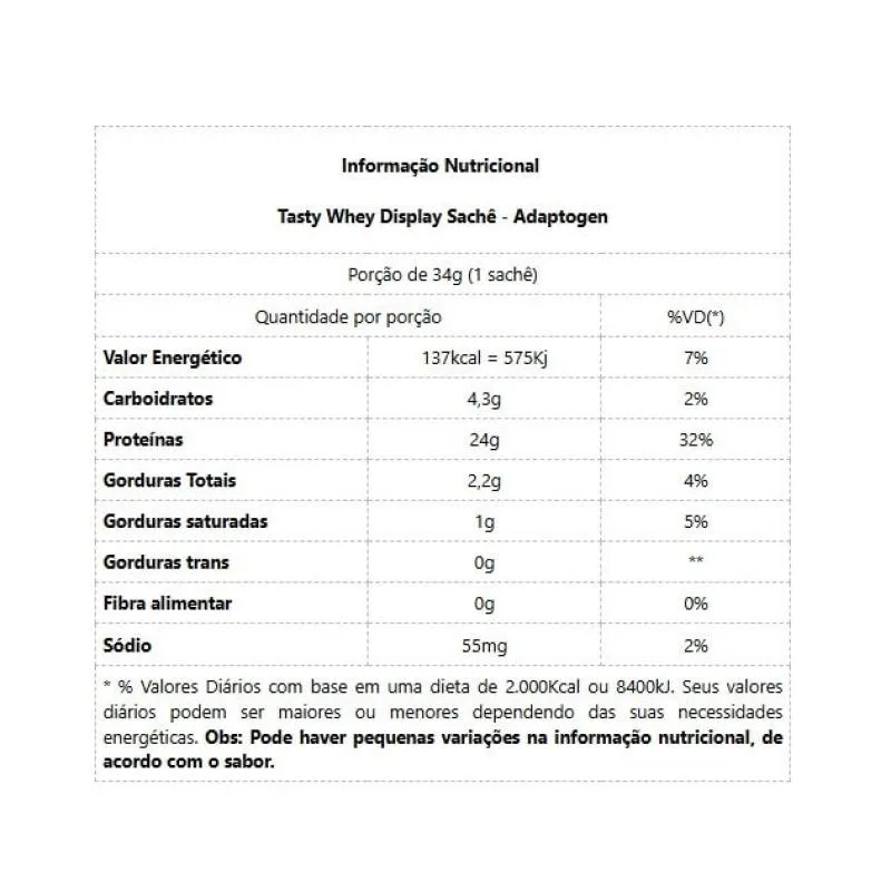 Tasty Whey - Adaptogen A premiada Tasty Whey mudou e está ainda melhor, com mais proteína e menos carboidrato, ela possui 24g de proteína, e o melhor, continua a proteína mais saborosa! Com alto valor biológico de excelente absorção; que auxilia no crescimento muscular. É uma ótima opção para quem gosta de criar receitas saudáveis, e por ter a absorção rápida de nutrientes (proteínas e aminoácidos) que o corpo necessita após atividade física intensa, recomenda-se a ingestão logo após o treino. Aprovado pela ANVISA e entrega 100% do que está no rótulo. Todos os produtos da Adaptogen Science passam por rigorosos testes nos EUA antes de serem distribuídos, prática que faz com que os consumidores confiem e atestem a qualidade dos suplementos que estão consumindo. Benefícios: * Altamente saborosa;* 24g de proteína por dose;* Auxilia no reparo a dano tecidual;* Auxilia no ganho de massa muscular;* Ideal para receitas fit;* 5,3g de bcaa;* 2,3g de leucine;* 100% whey protein;* 3,3 g de glutamine.