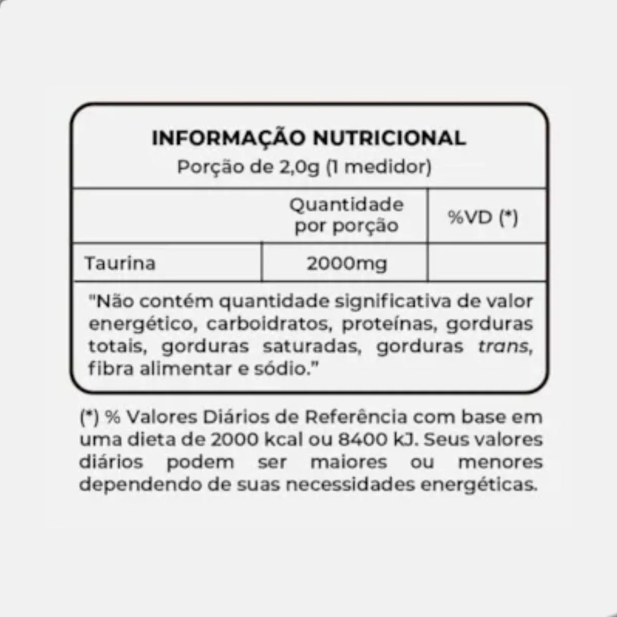 Sua composição taurina de grau farmacêutico, sem adição de açúcares ou corantes; livre de glúten. e não inclui componentes de origem animal ou alergênicos comuns, adaptando-se a diferentes estilos de vida.