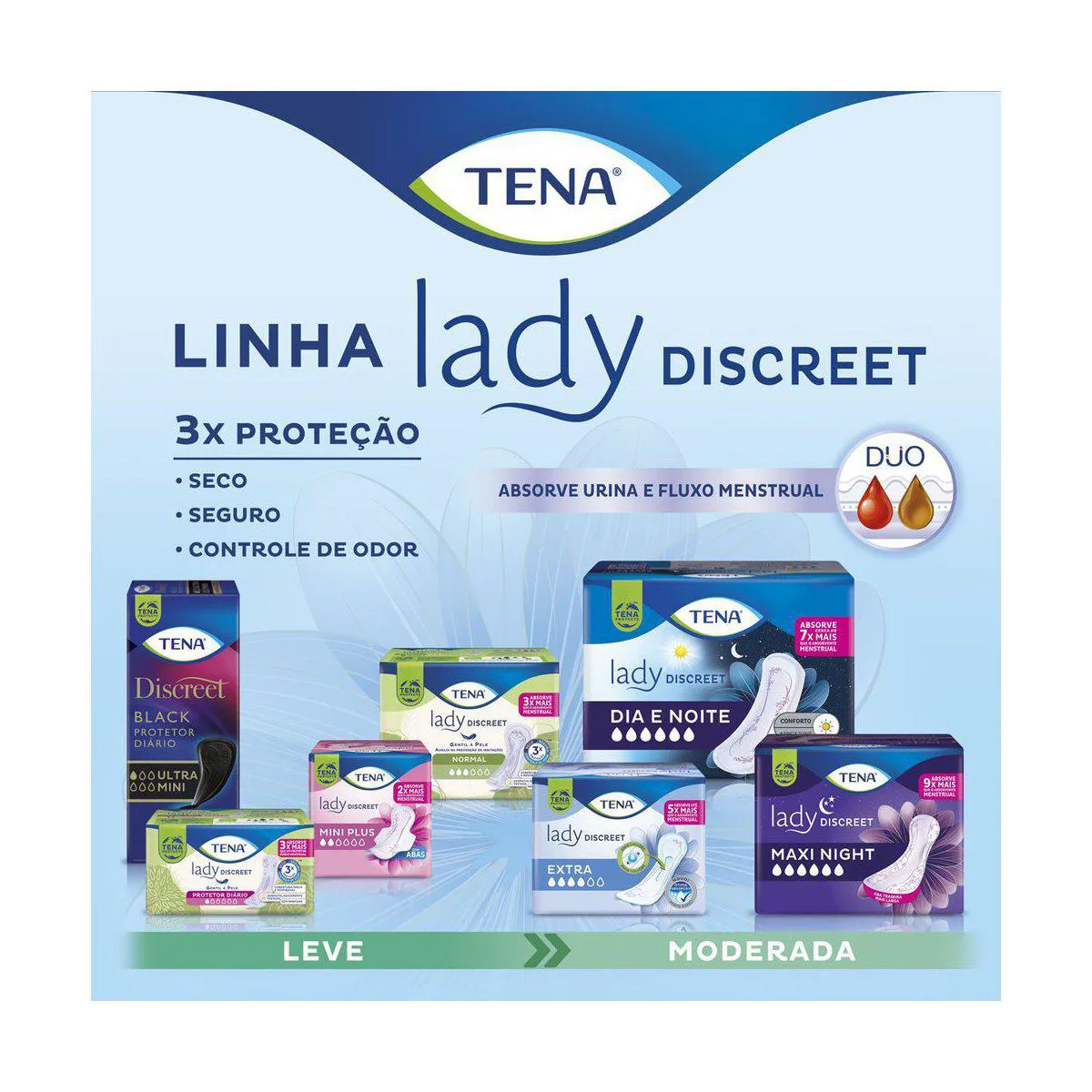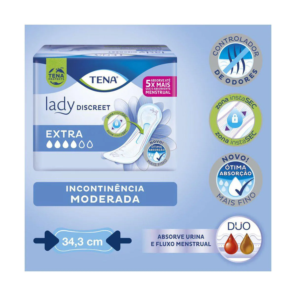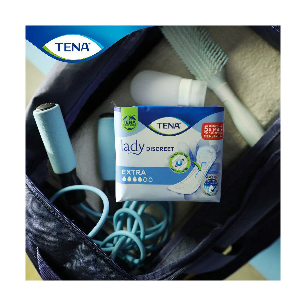 O Tena Lady Discreet Extra é um absorvente íntimo feminino que, diferente dos convencionais, pode ser usado não só em casos de incontinência urinária, mas, também, durante o fluxo menstrual, oferecendo proteção e conforto no dia a dia.