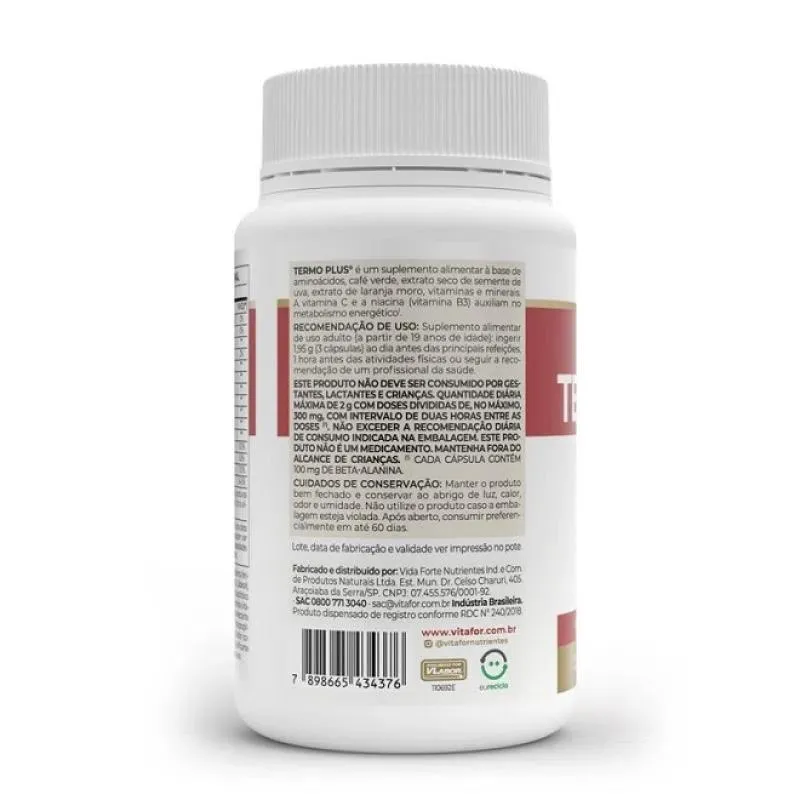 Termo Plus 650mg (90 caps) TERMO PLUS é um suplemento alimentar à base de aminoácidos, café verde, extrato seco de semente de uva, laranja moro (Citrus sinensis L. Osbeck), vitaminas e minerais. Mais energia para treinar fazem treinos melhores, e treinos melhores aceleram os resultados esperados. TERMOPLUS é o termogênico da Vitafor pensado para te ajudar em todas as horas do seu dia. Outra aplicação para os termogênicos é na utilização como pré-treino. Quando utilizado antes dos treinos, além de aumentar o gasto calórico, muitos deles atuam como estimulantes, contribuindo para a melhora do desempenho esportivo. Diferenciais: - Formulação Inovadora;- Contém Laranja Moro;- Cafeína 120 mg por porção;- Com ácido clorogênico;- Adicionado de aminoácidos, vitaminas e minerais;- Praticidade no formato cápsula. Benefícios: - A cafeína auxilia no aumento do estado de alerta e na melhora da concentração e no aumento da capacidade de resistência e no desempenho de exercícios físicos de resistência;- A vitamina c e a niacina (vitamina B3) auxiliam no metabolismo energético;- A vitamina C e o zinco auxiliam no funcionamento do sistema imune;- A niacina contribui para a manutenção da pele e o zinco contribui para a manutenção do cabelo, da pele e das unhas;- A niacina, o cromo e o zinco auxiliam no metabolismo de proteínas, carboidratos e gorduras e a vitamina C auxilia no metabolismo de proteínas e gorduras, na absorção de ferro dos alimentos, na formação de colágeno;- A vitamina C e o zinco são antioxidantes que auxiliam na proteção dos danos causados pelos radicais livres;- O zinco auxilia na visão, no metabolismo da vitamina A, na síntese de proteínas e na manutenção de ossos.