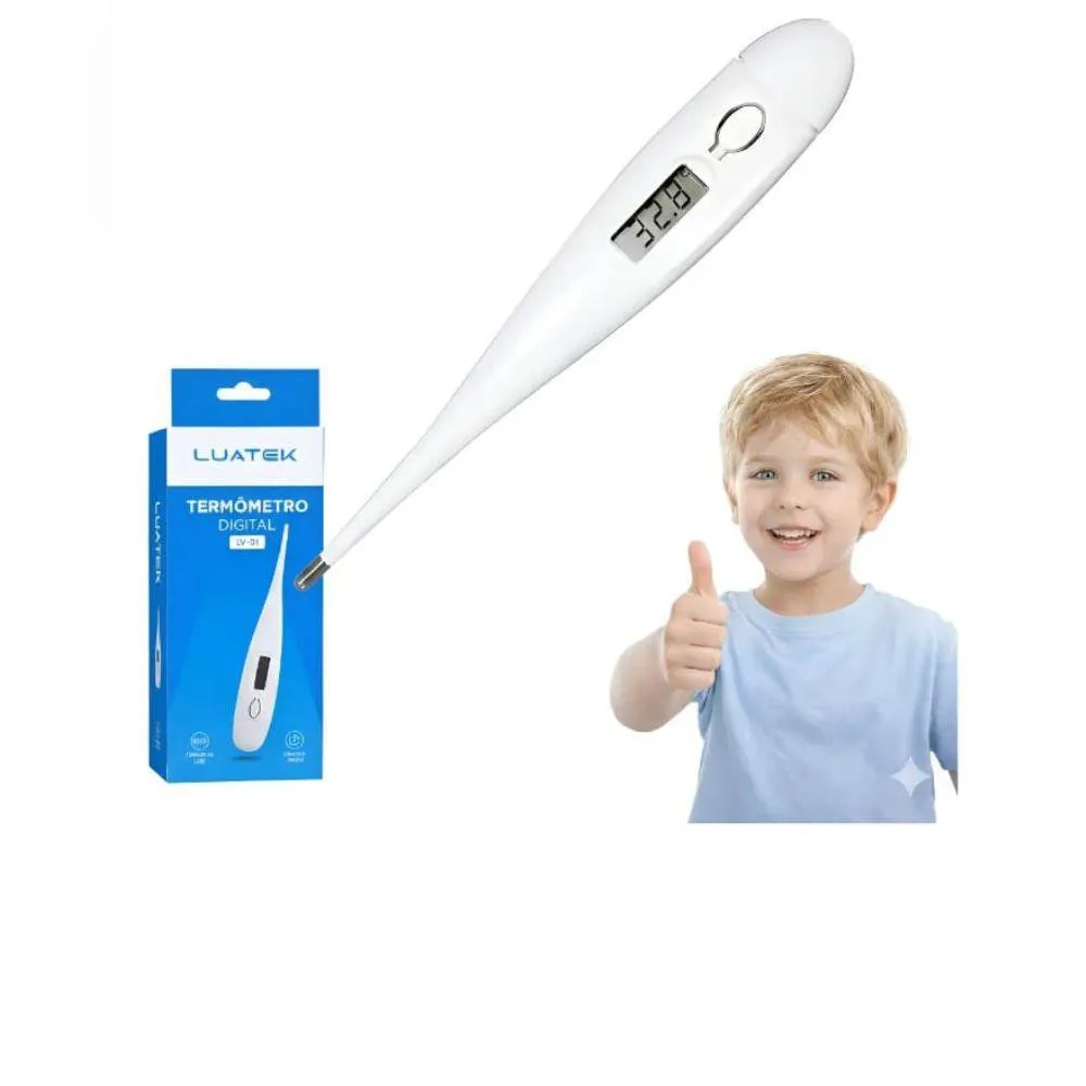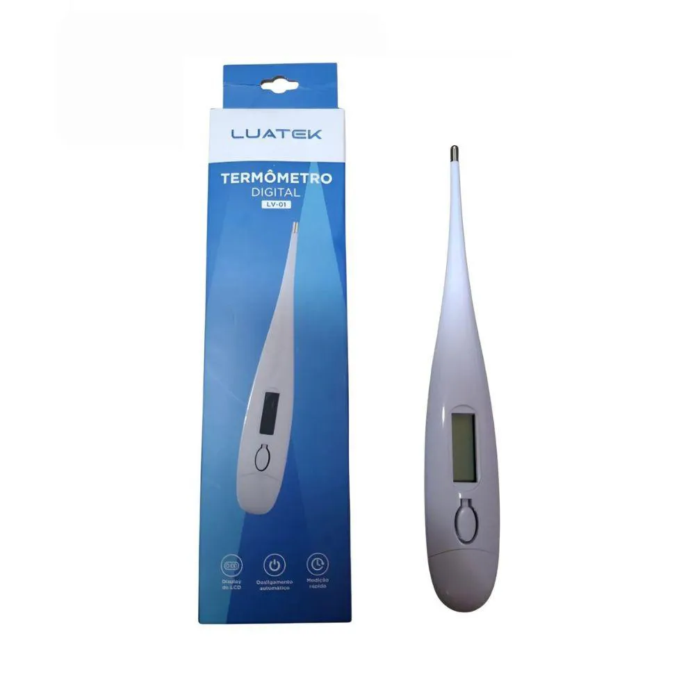 O termômetro digital em material plástico resistente, permie fácil higienização e uso seguro no dia a dia. Conta com visor eletrônico (LCD) que exibe com clareza a temperatura corporal, medida por um sensor localizado na extremidade inferior do equipamento, onde a ponta metálica entra em contato direto com o corpo. Funciona com bateria alojada em compartimento na parte superior do termômetro e emite um alarme sonoro ao final da medição, garantindo praticidade e confiança no uso. É um item essencial em qualquer kit de primeiros socorros, tanto para uso doméstico quanto profissional. Características: